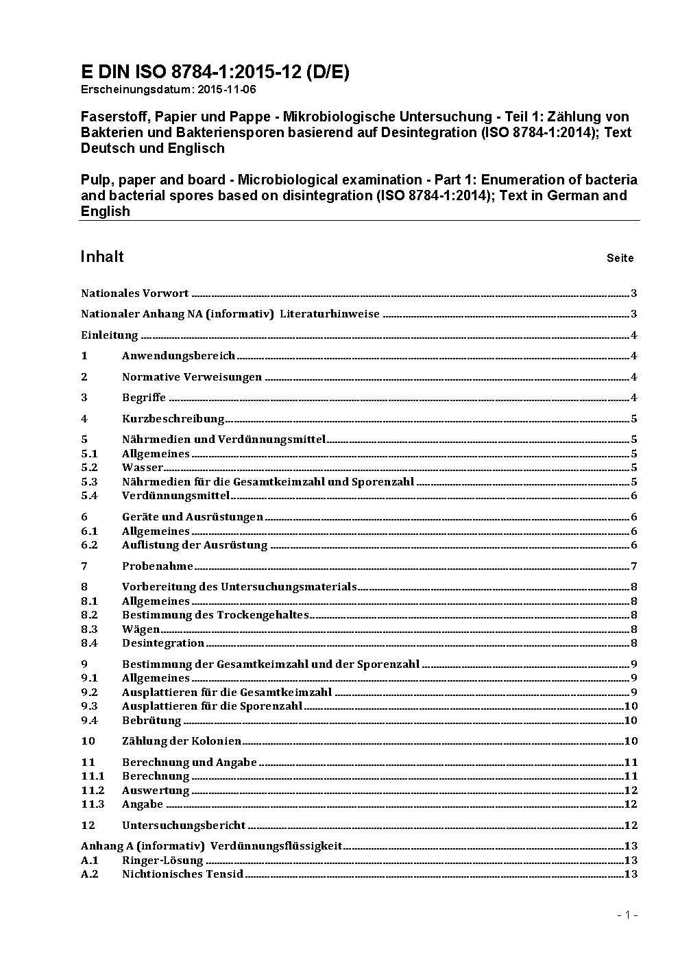 Faserstoff, Papier und Pappe - Mikrobiologische Untersuchung - Teil 1: Zählung von Bakterien und bakteriellen Sporen nach Desintegration (ISO 8784-1:2014)