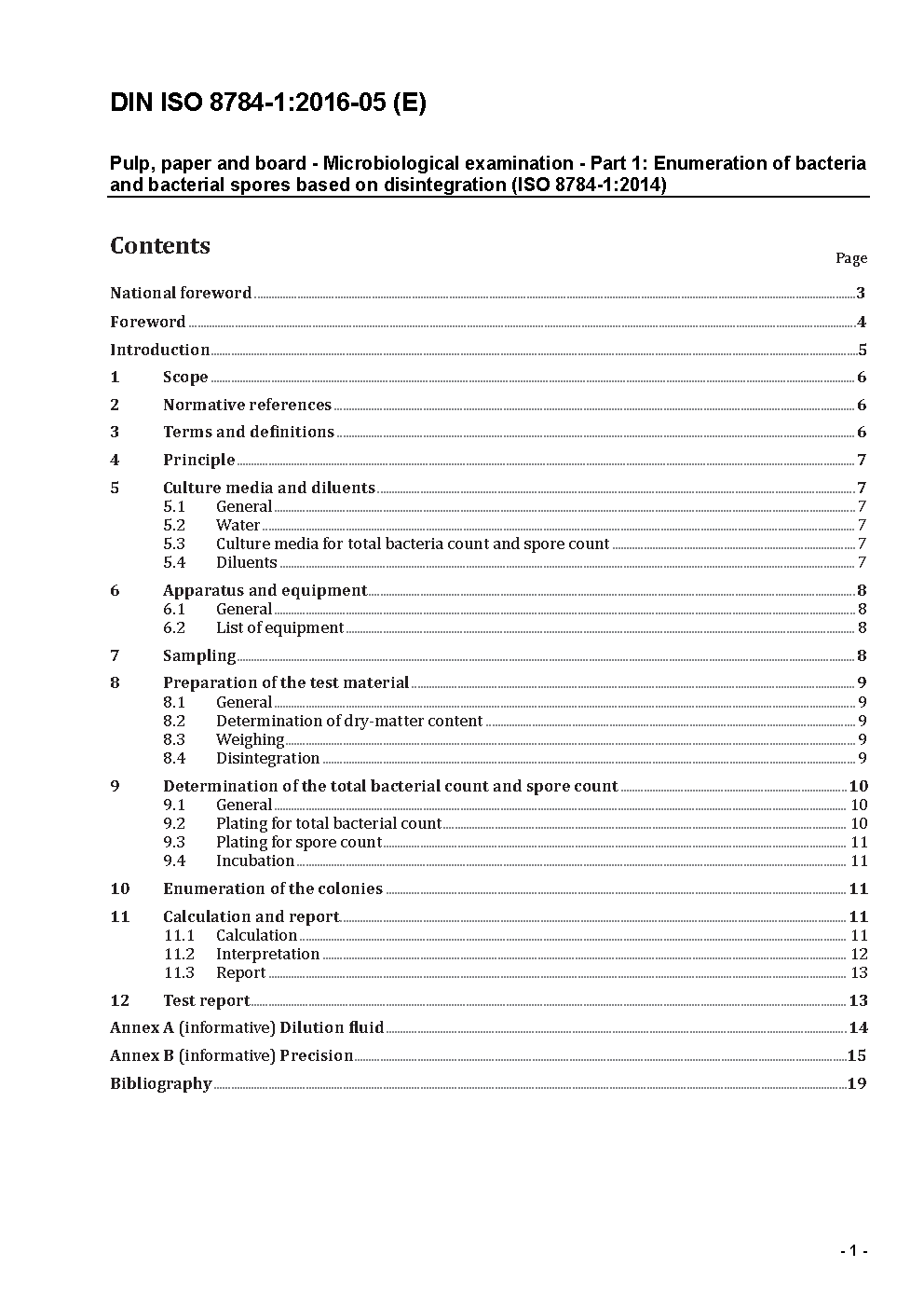 Pulp, paper and board - Microbiological examination - Part 1: Enumeration of bacteria and bacterial spores based on disintegration (ISO 8784-1:2014)