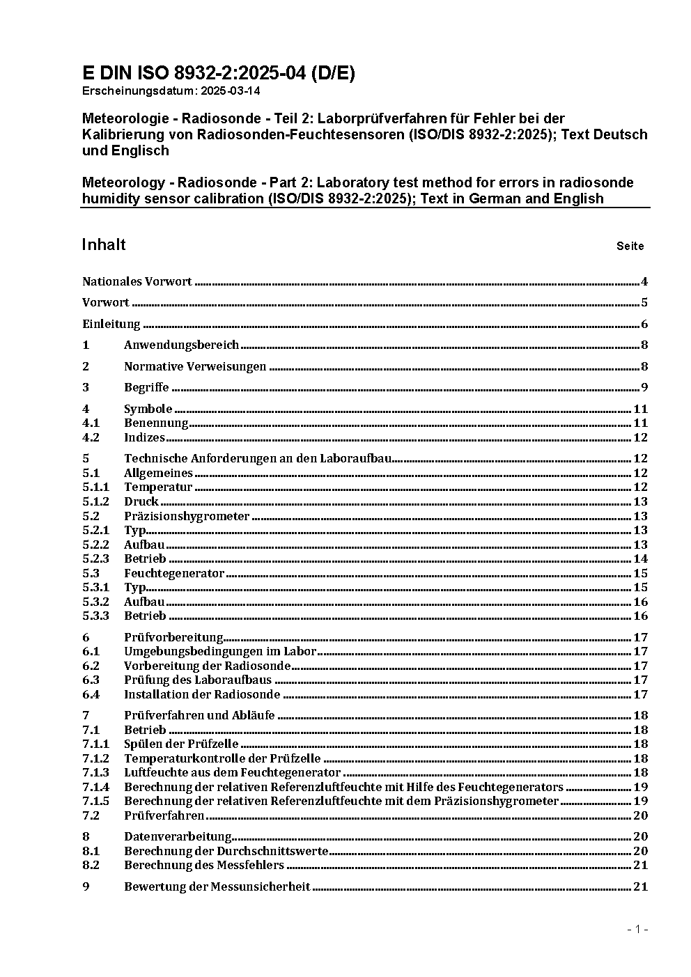 Meteorology - Radiosonde - Part 2: Laboratory test method for errors in radiosonde humidity sensor calibration (ISO/DIS 8932-2:2025); Text in German and English