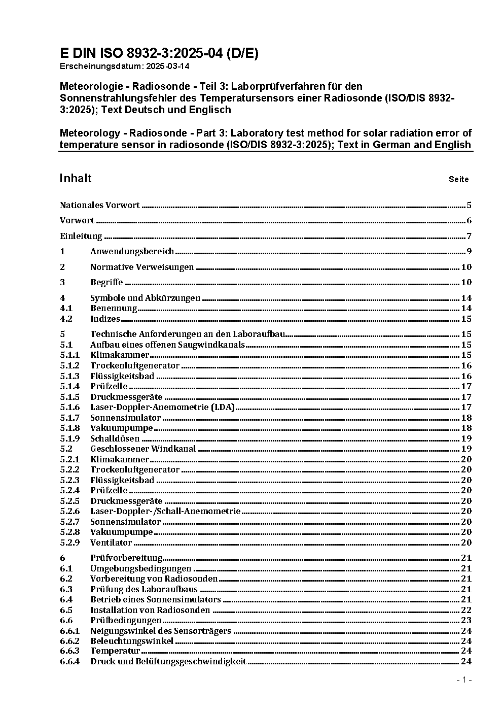 Meteorologie - Radiosonde - Teil 3: Laborprüfverfahren für den Sonnenstrahlungsfehler des Temperatursensors einer Radiosonde (ISO/DIS 8932-3:2025); Text Deutsch und Englisch