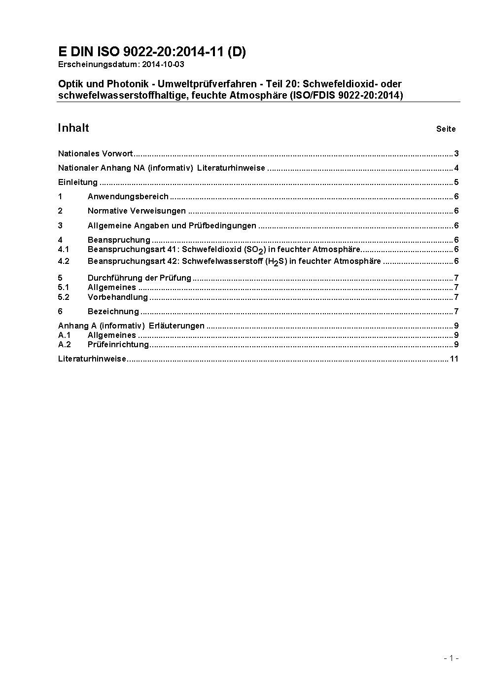 Optik und Photonik - Umweltprüfverfahren - Teil 20: Schwefeldioxid- oder schwefelwasserstoffhaltige, feuchte Atmosphäre (ISO/FDIS 9022-20:2014)