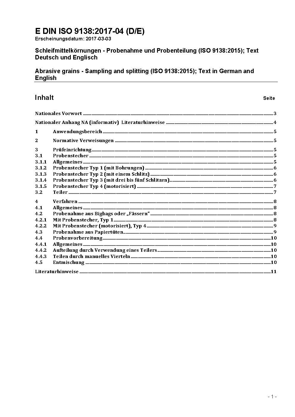 Schleifmittelkörnungen - Probenahme und Probenteilung (ISO 9138:2015); Text Deutsch und Englisch