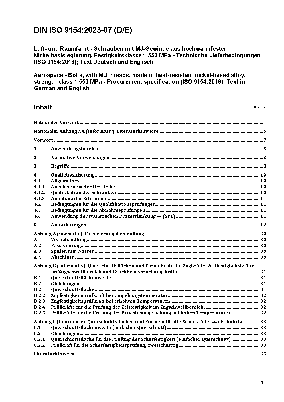 Aerospace - Bolts, with MJ threads, made of heat-resistant nickel-based alloy, strength class 1550 MPa - Procurement specification (ISO 9154:1999); Text in German and English