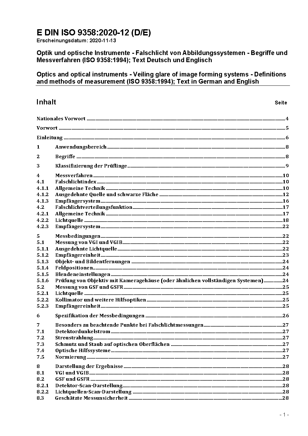 Optics and optical instruments - Veiling glare of image forming systems - Definitions and methods of measurement (ISO 9358:1994); Text in German and English