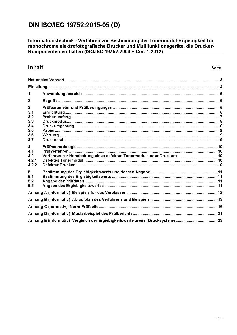 Informationstechnik - Verfahren zur Bestimmung der Tonermodul-Ergiebigkeit für monochrome elektrofotografische Drucker und Multifunktionsgeräte, die Drucker-Komponenten enthalten (ISO/IEC 19752:2004 + Cor. 1:2012)