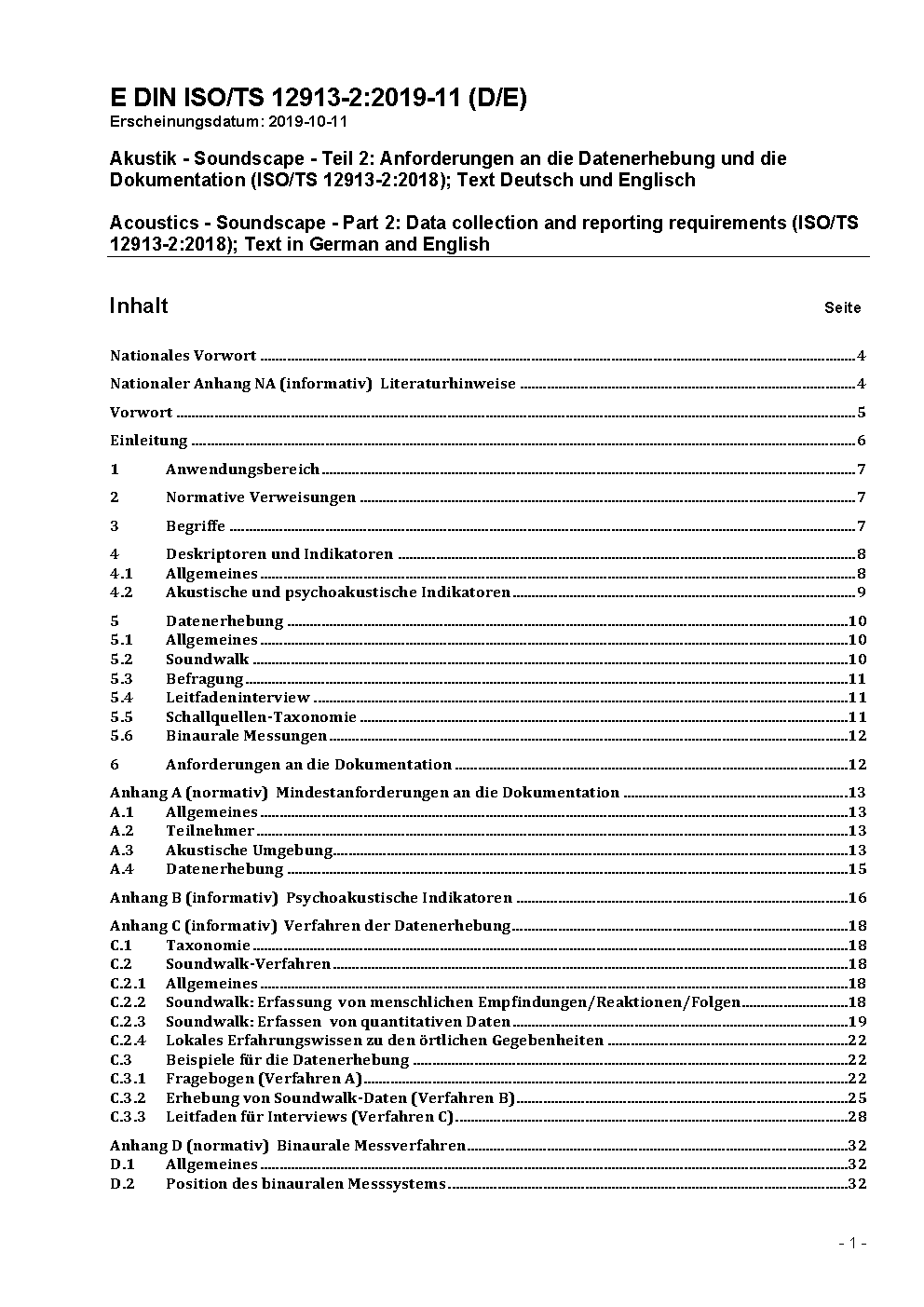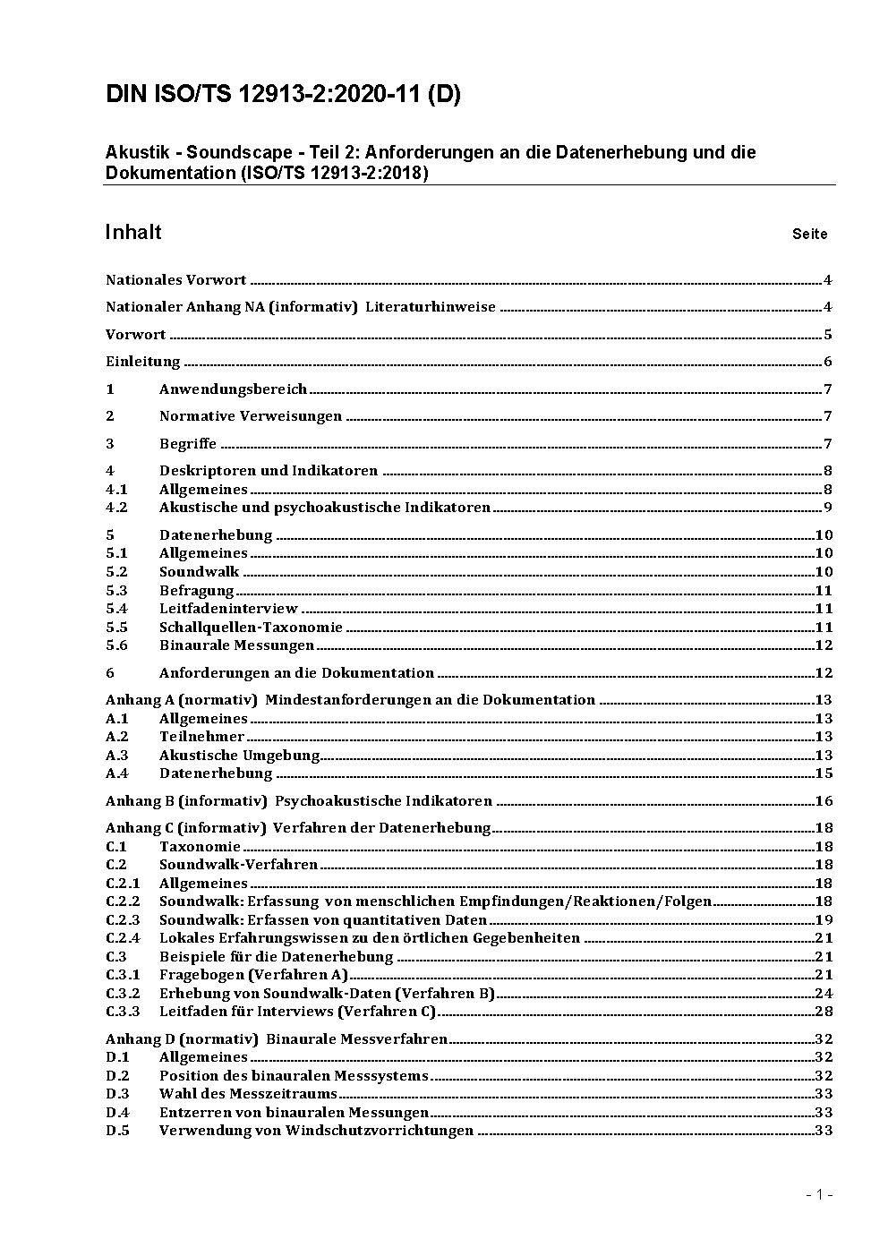 Akustik - Soundscape - Teil 2: Anforderungen an die Datenerhebung und die Dokumentation (ISO/TS 12913-2:2018)