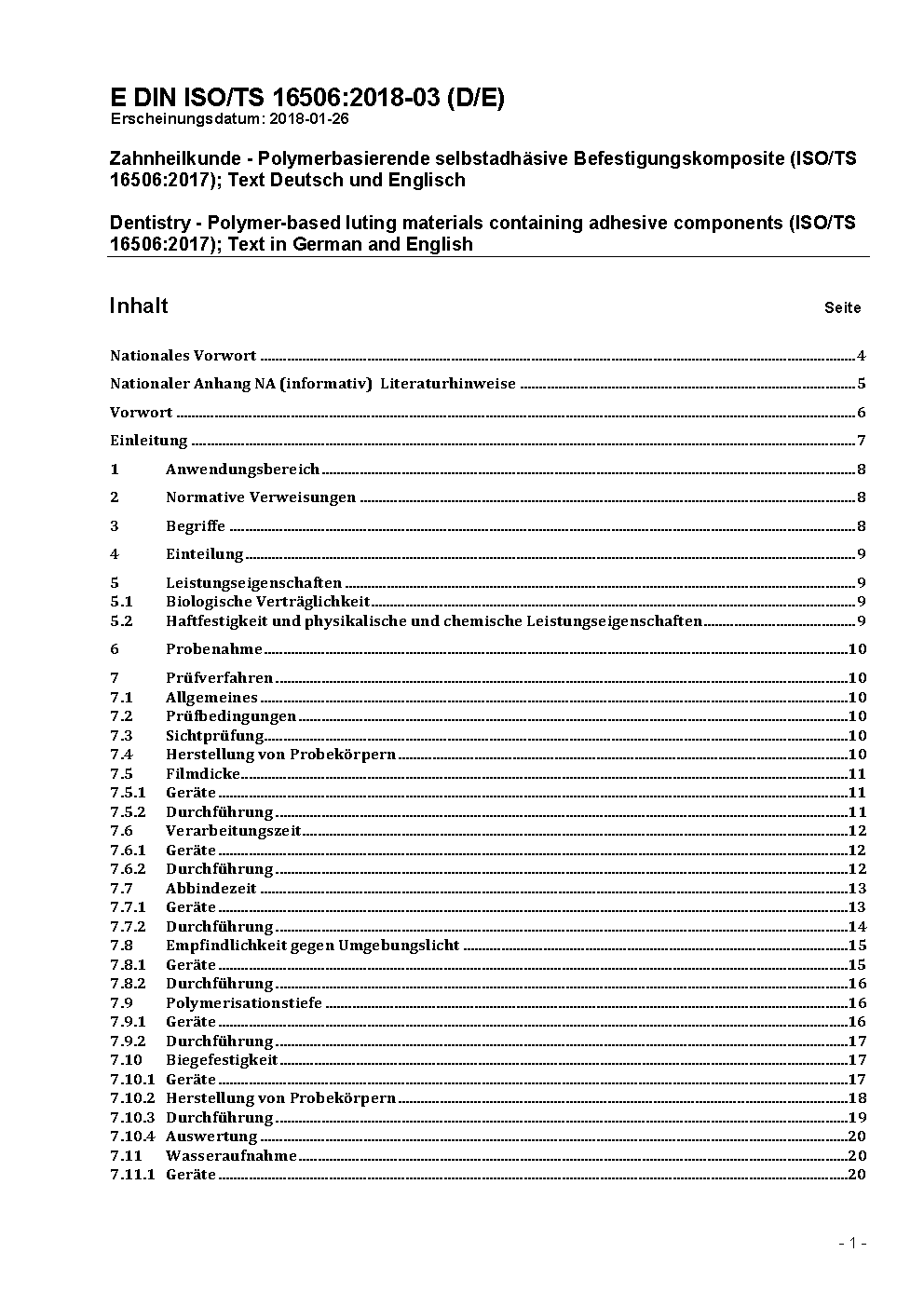 Zahnheilkunde - Polymerbasierende selbstadhäsive Befestigungskomposite (ISO/TS 16506:2017); Text Deutsch und Englisch