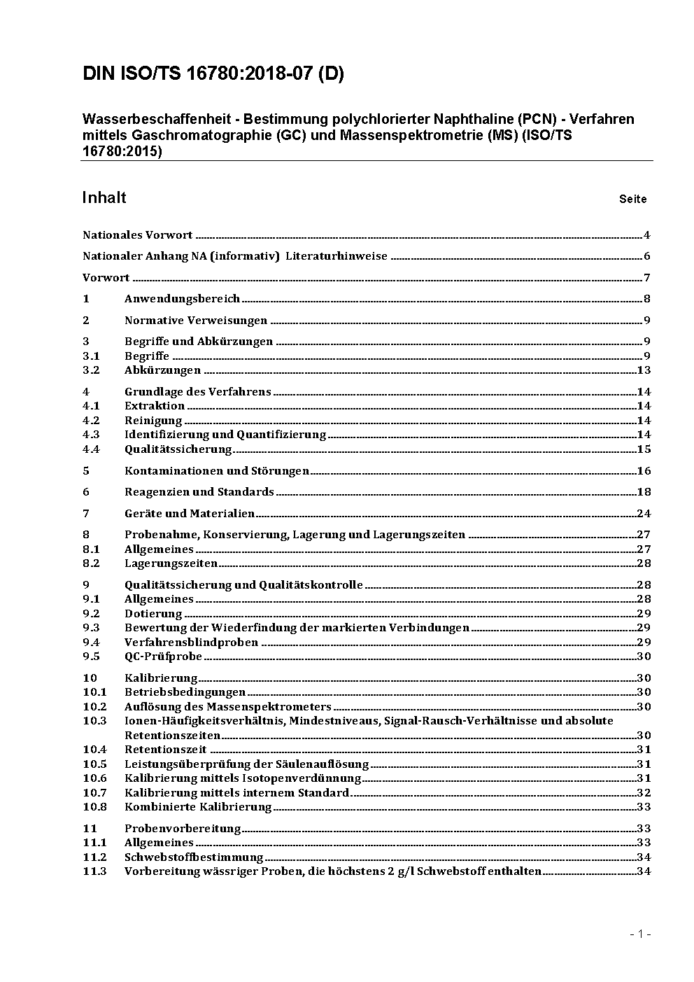 Wasserbeschaffenheit - Bestimmung polychlorierter Naphthaline (PCN) - Verfahren mittels Gaschromatographie (GC) und Massenspektrometrie (MS) (ISO/TS 16780:2015)