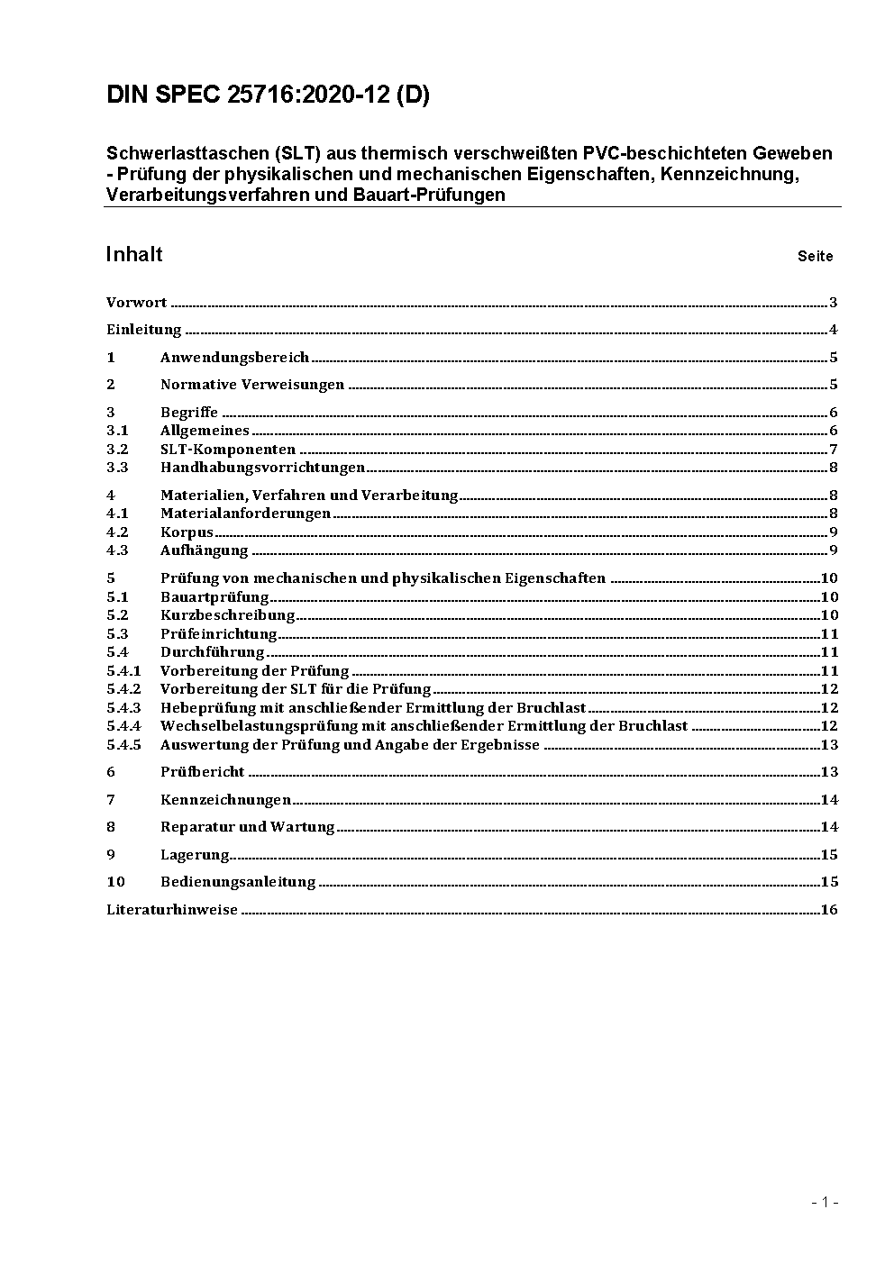 Schwerlasttaschen (SLT) aus thermisch verschweißten PVC-beschichteten Geweben - Prüfung der physikalischen und mechanischen Eigenschaften, Kennzeichnung, Verarbeitungsverfahren und Bauart-Prüfungen