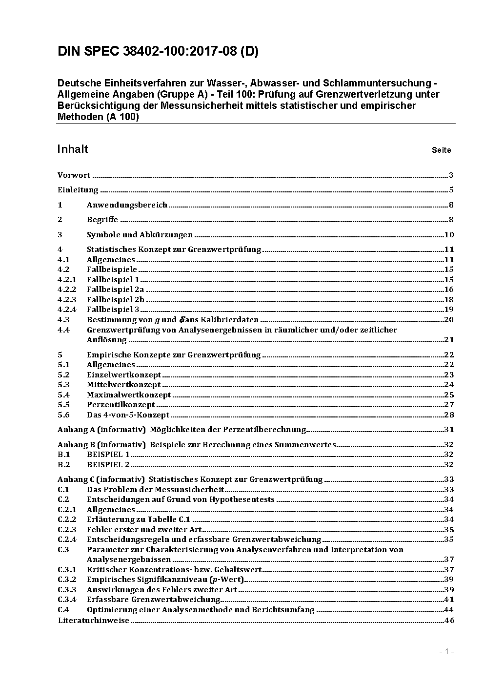 Deutsche Einheitsverfahren zur Wasser-, Abwasser- und Schlammuntersuchung - Allgemeine Angaben (Gruppe A) - Teil 100: Prüfung auf Grenzwertverletzung unter Berücksichtigung der Messunsicherheit mittels statistischer und empirischer Methoden (A 100)