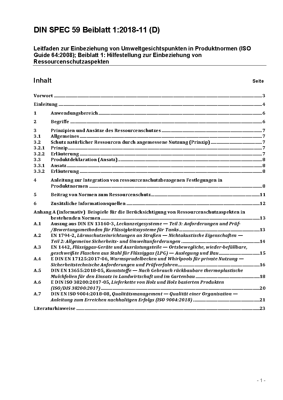 Leitfaden zur Einbeziehung von Umweltgesichtspunkten in Produktnormen (ISO Guide 64:2008); Beiblatt 1: Hilfestellung zur Einbeziehung von Ressourcenschutzaspekten