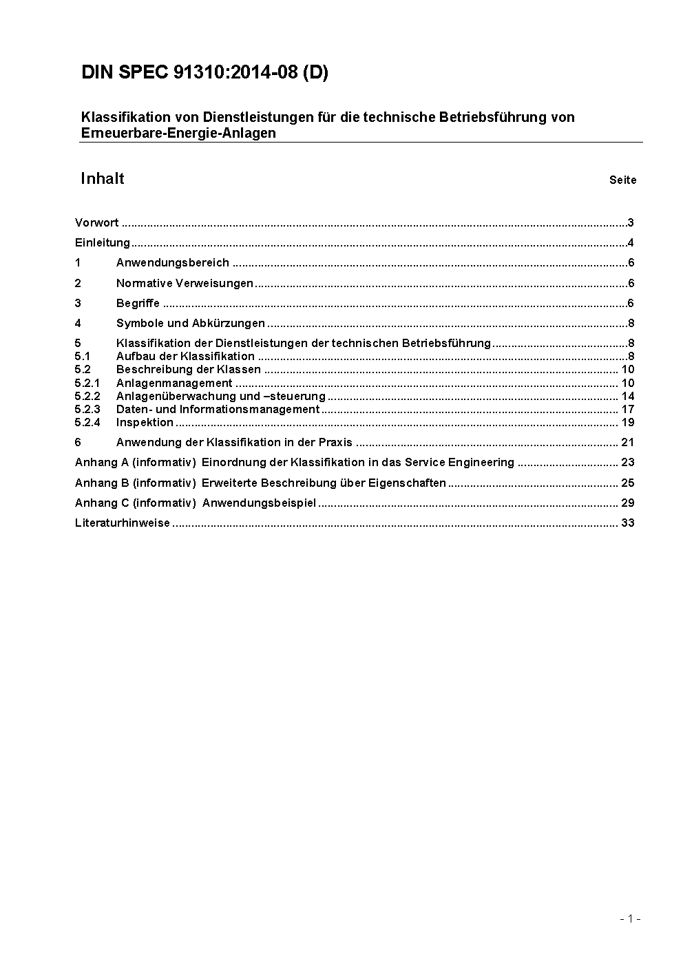 Klassifikation von Dienstleistungen für die technische Betriebsführung von Erneuerbare-Energie-Anlagen
