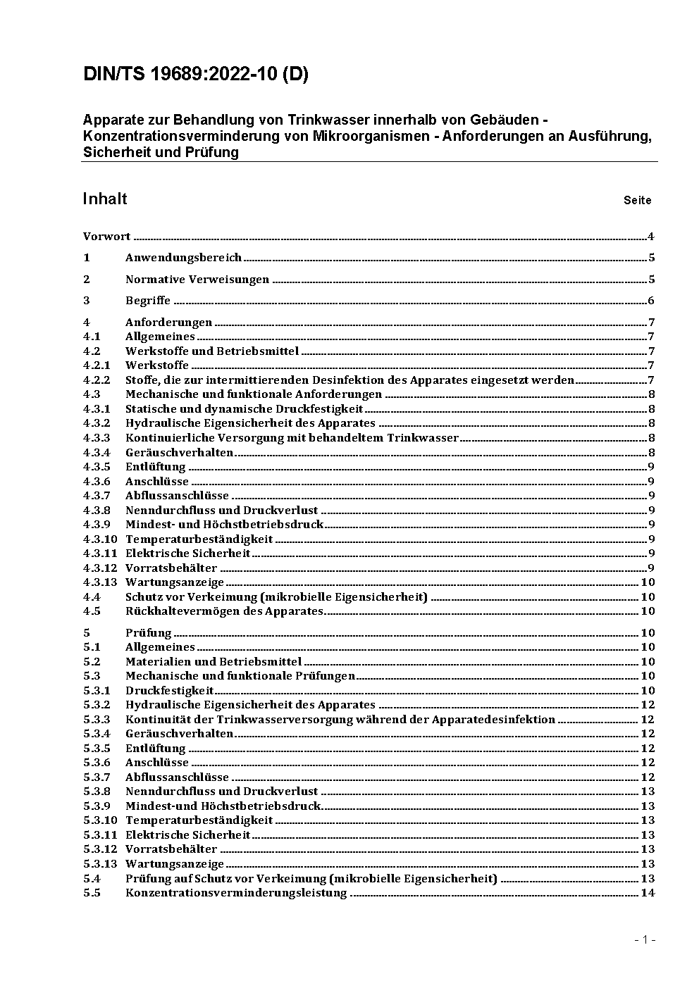 Apparate zur Behandlung von Trinkwasser innerhalb von Gebäuden - Konzentrationsverminderung von Mikroorganismen - Anforderungen an Ausführung, Sicherheit und Prüfung