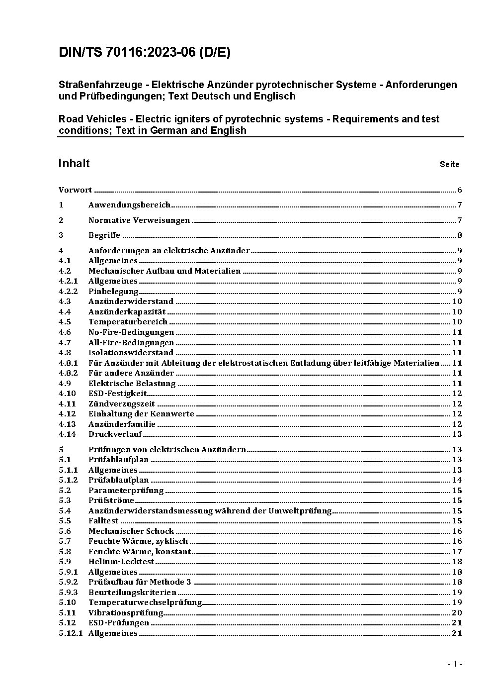 Road Vehicles - Electric igniters of pyrotechnic systems - Requirements and test conditions; Text in German and English