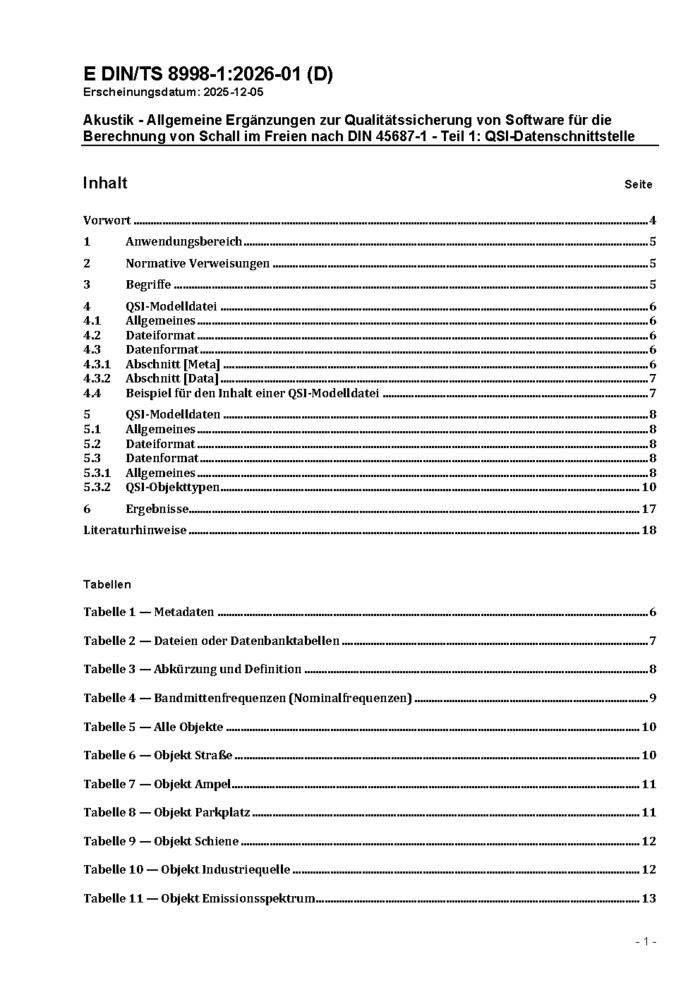 Akustik - Allgemeine Ergänzungen zur Qualitätssicherung von Software für die Berechnung von Schall im Freien nach DIN 45687-1 - Teil 1: QSI-Datenschnittstelle