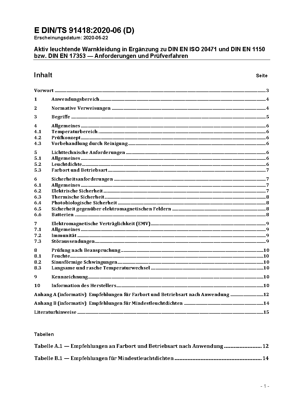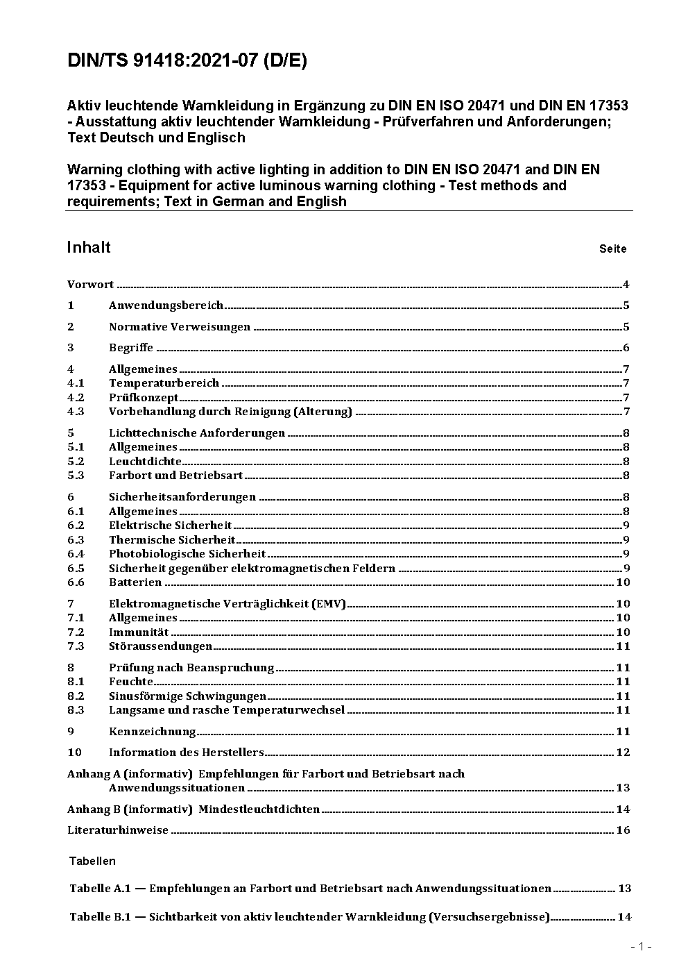 Aktiv leuchtende Warnkleidung in Ergänzung zu DIN EN ISO 20471 und DIN EN 17353 - Ausstattung aktiv leuchtender Warnkleidung - Prüfverfahren und Anforderungen; Text Deutsch und Englisch