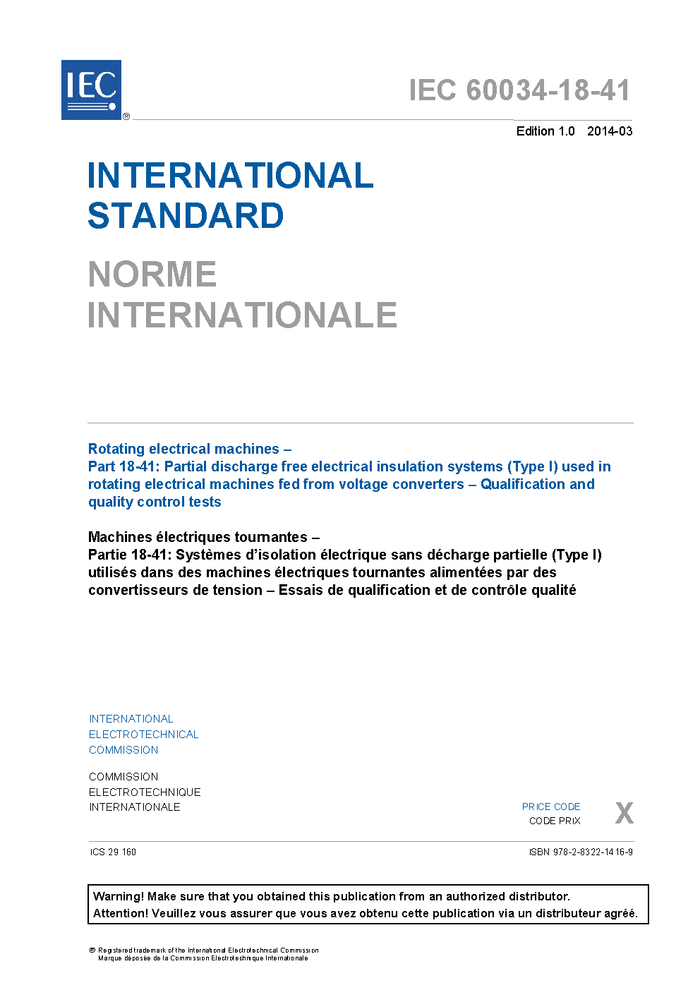 IEC 60034-18-41:2014 defines criteria for assessing the insulation system of stator/rotor windings which are subjected to voltage-source pulse-width-modulation drives. It applies to stator/rotor windings of single or polyphase AC machines with insulation systems for converter operation. It describes qualification tests and quality control (type and routine) tests on representative samples or on completed machines which verify fitness for operation with voltage source converters.