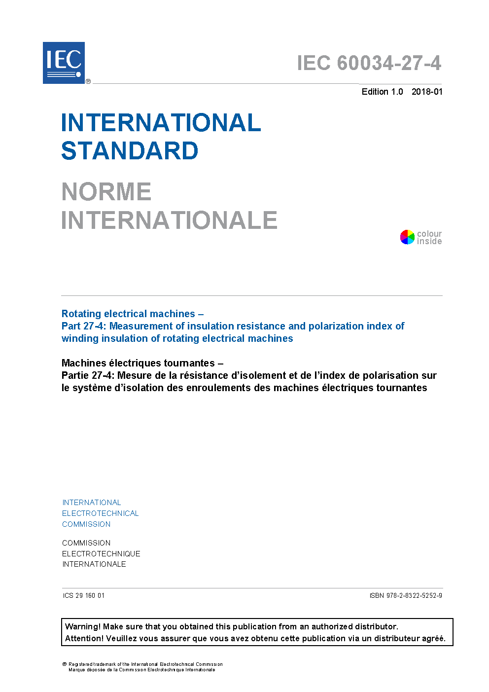 IEC 60034-27-4:2018 provides recommended test procedures for the measurement of insulation resistance and polarization index of stator and rotor winding insulation of rotating electrical machines. This document recommends minimum acceptable values of insulation resistance and polarization index of winding insulation valid for fully processed low and high voltage AC and DC rotating electrical machines with a rated power of 750 W or higher.