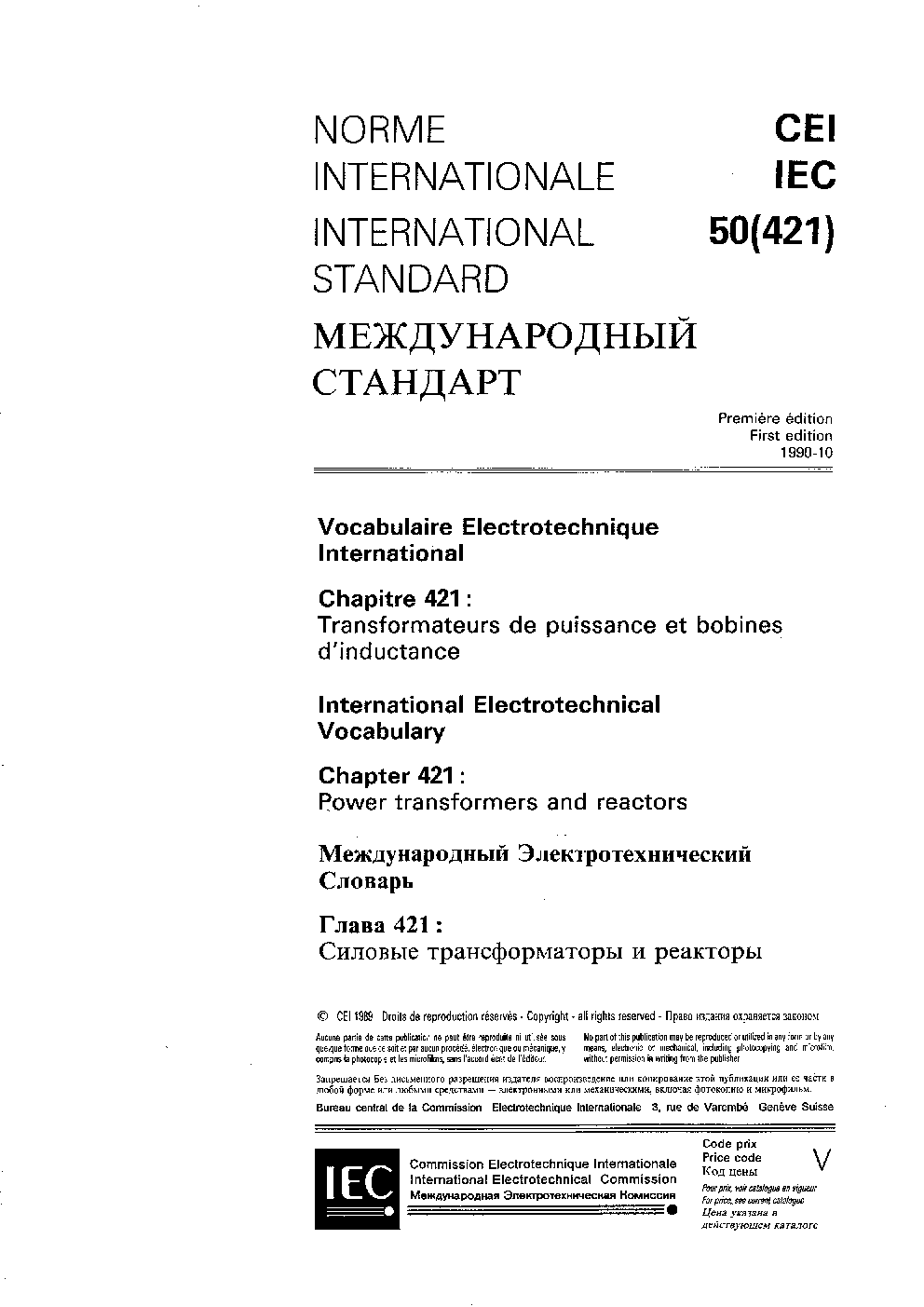 IEC 60050-421:1990 International Electrotechnical Vocabulary (IEV) - Part 421: Power transformers and reactors