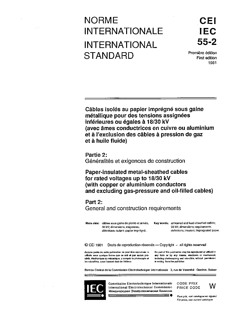 IEC 60055-2:1981 Paper-insulated metal-sheathed cables for rated voltages up to 18/30 kV (with copper or aluminium conductors and excluding gas-pressure and oil-filled cables). Part 2: General and construction requirements
