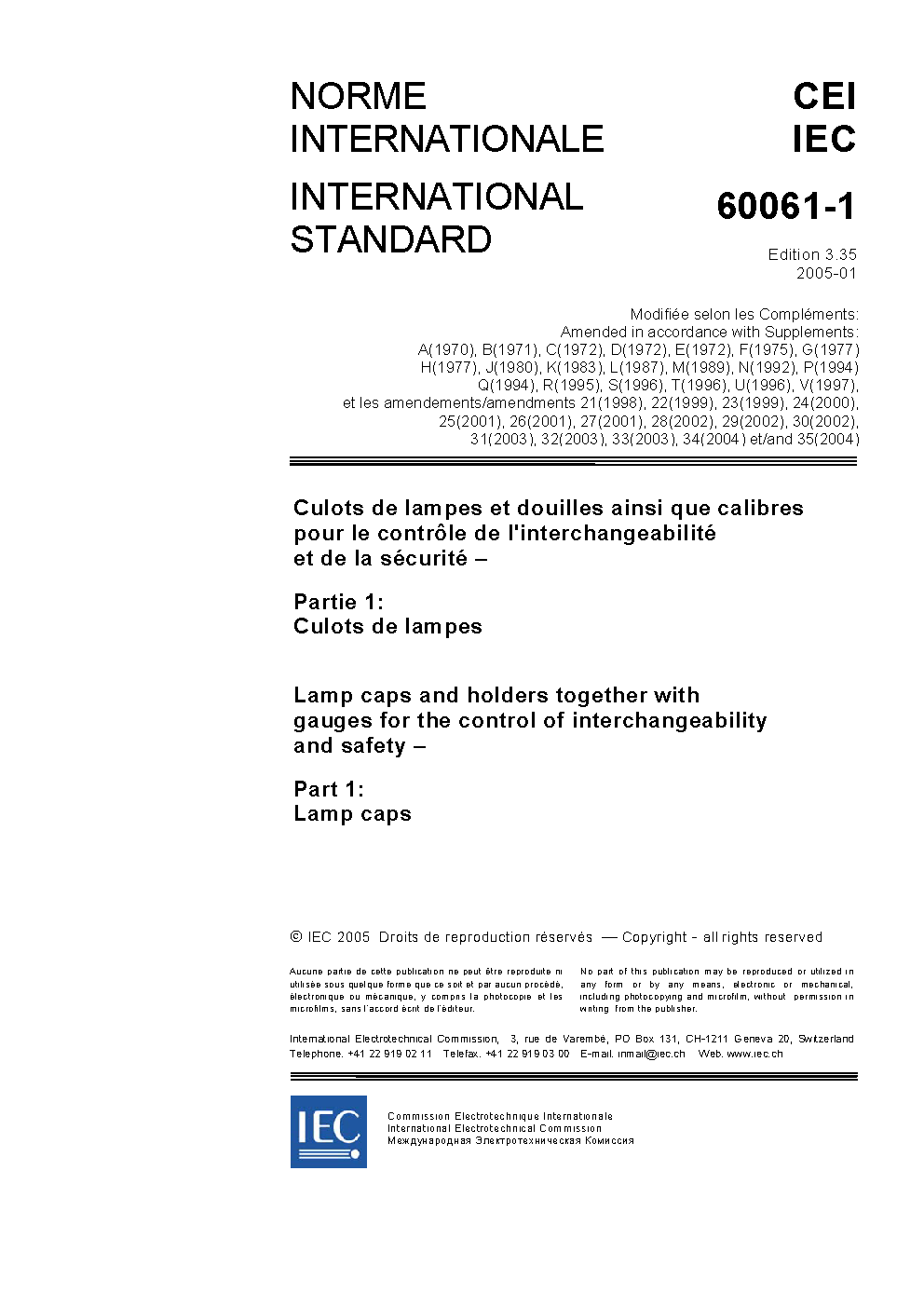 IEC 60061-1:1969/AMD29:2002 Amendment 29 - Lamp caps and holders together with gauges for the control of interchangeability and safety. Part 1: Lamp caps