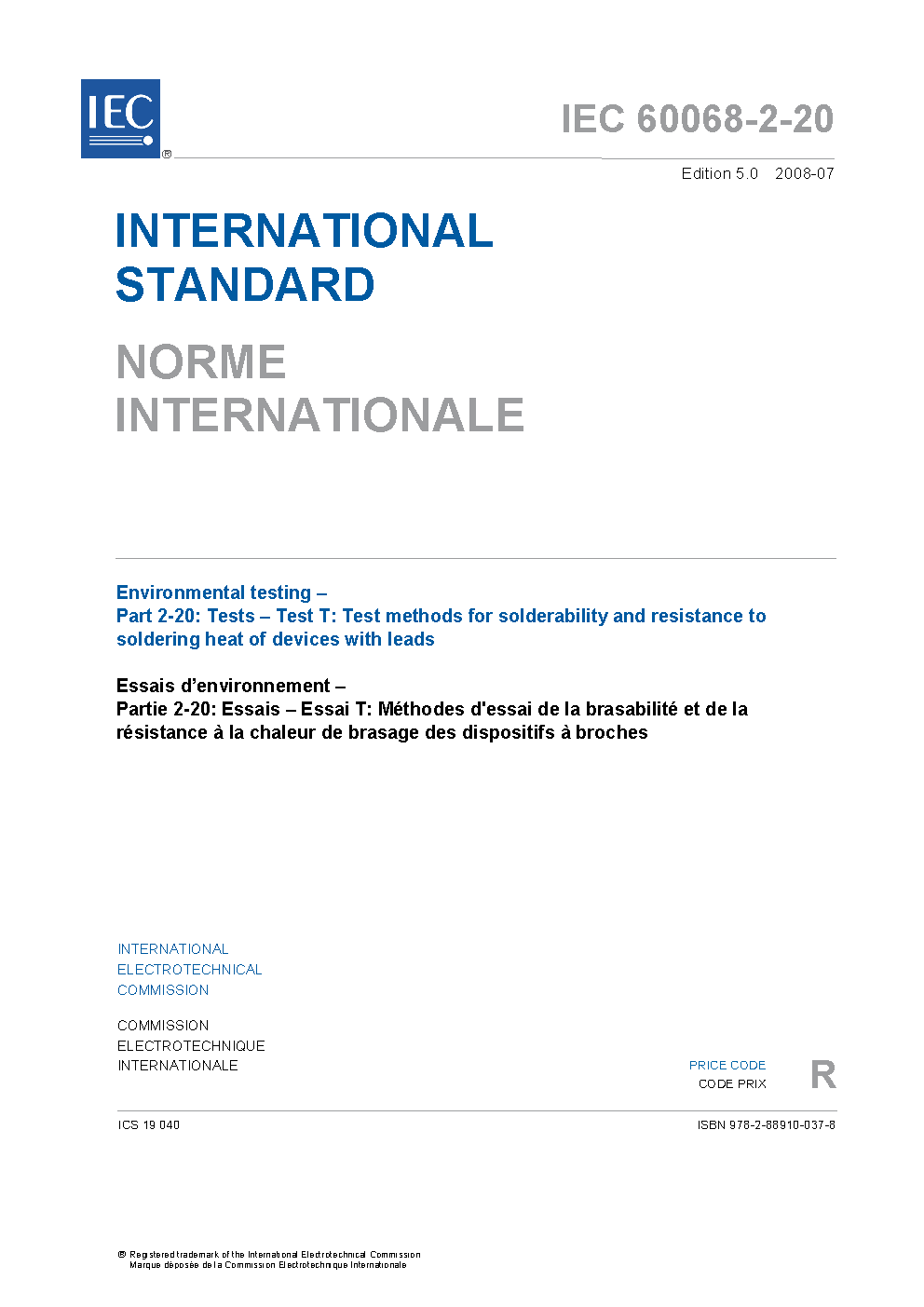 IEC 60068-2-20:2021 outlines Tests Ta and Tb, applicable to devices with leads and leads themselves. Soldering tests for surface mounting devices (SMD) are described in IEC 60068-2-58. This document provides procedures for determining the solderability and resistance to soldering heat of devices in applications using solder alloys, which are eutectic or near eutectic tin lead (Pb), or lead-free alloys. The procedures in this document include the solder bath method and soldering iron method. The objective of this document is to ensure that component lead or termination solderability meets the applicable solder joint requirements of IEC 61191-3 and IEC 61191-4. In addition, test methods are provided to ensure that the component body can be resistant to the heat load to which it is exposed during soldering. This edition includes the following significant technical changes with respect to the previous edition: