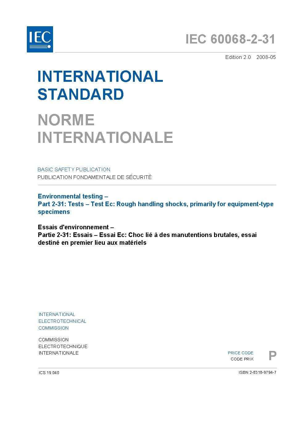 IEC 60068-2-31:2008 deals with a test procedure for simulating the effects of rough handling shocks, primarily in equipment-type specimens, the effects of knocks, jolts and falls which may be received during repair work or rough handling in operational use. This procedure does not simulate the effects of impacts received during transportation as loosely constrained cargo. Where the effects of loose cargo transportation are to be assessed, test Ee: Bounce should be used. Also this procedure does not simulate the effects of shock applied to installed equipments. Where this effect is to be assessed refer to test Ea: Shock. Testing should only be specified for equipment likely to receive such rough handling, for example those of small to medium size and mass, and should only be applied to those faces and corners where there is a risk of such treatment being encountered. In general, equipment which is frequently handled and serviced (for example field equipment and unit spares) can be considered at risk, whereas equipment forming an integral part of a permanent installation would not normally be considered at risk and need not be tested. Testing may not be applicable to fragile unprotected equipment of irregular shape (for example aircraft nose radar) which, when removed from the installation would be contained in a handling frame or jig. It may however be applicable to these items of equipment when they are in their transit case or in their handling frame or jig. For equipment which stands only on one face (for example the normal base) the test is generally only applied to that face. Shock tests are performed on the specimen when fixed to the test machine. Drop and topple, free fall, repeated free fall and bounce tests are performed with the specimen free. This second edition cancels and replaces the first edition, published in 1969 and constitutes a technical revision. The major changes with regard to the previous edition concern the introduction of soft packaging tests, where appropriate. This new edition of IEC 60068-2-31 now incorporates the second edition of IEC 60068-2-32 (1975).