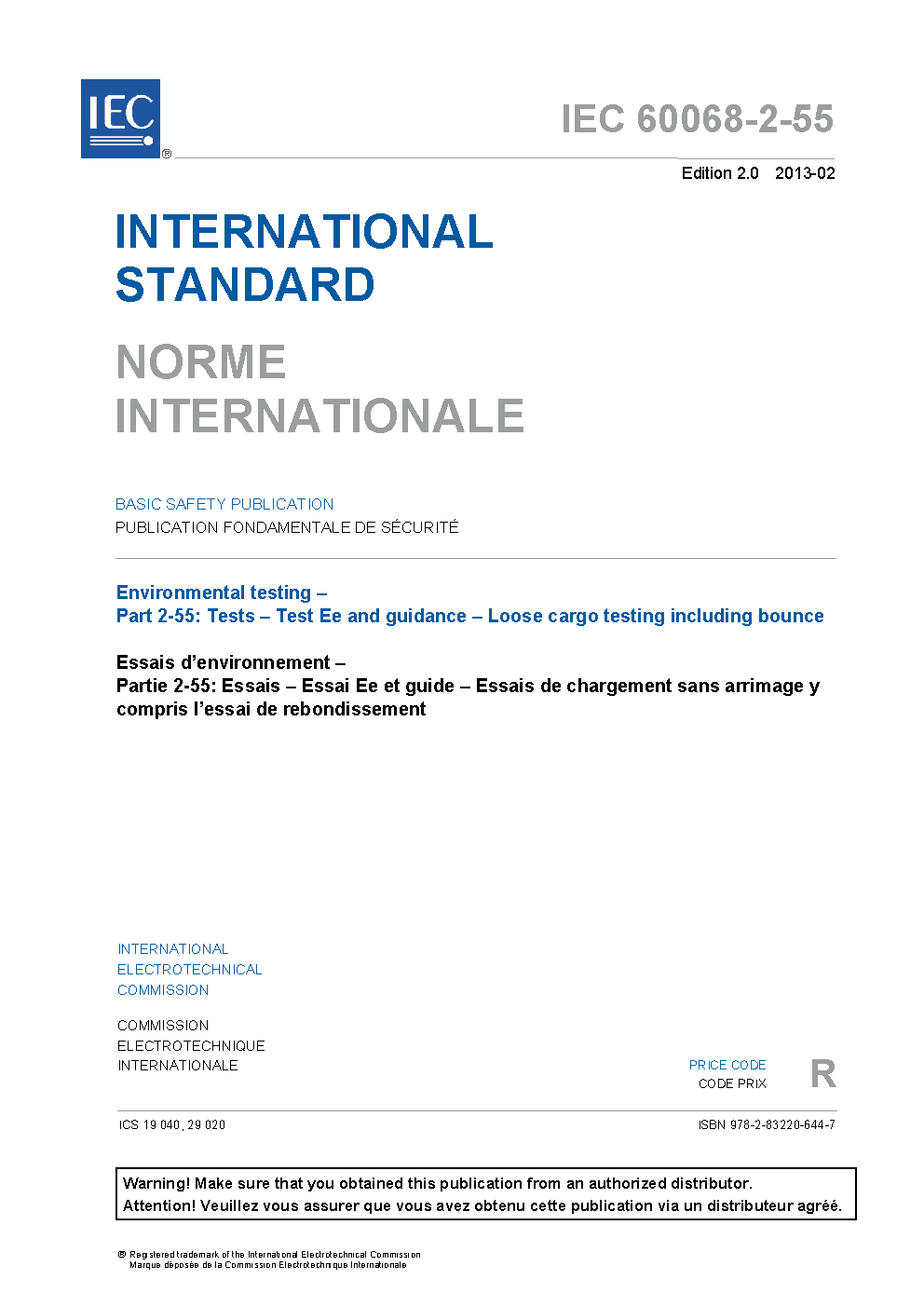IEC 60068-2-55:2013 Environmental testing - Part 2-55: Tests - Test Ee and guidance - Loose cargo testing including bounce