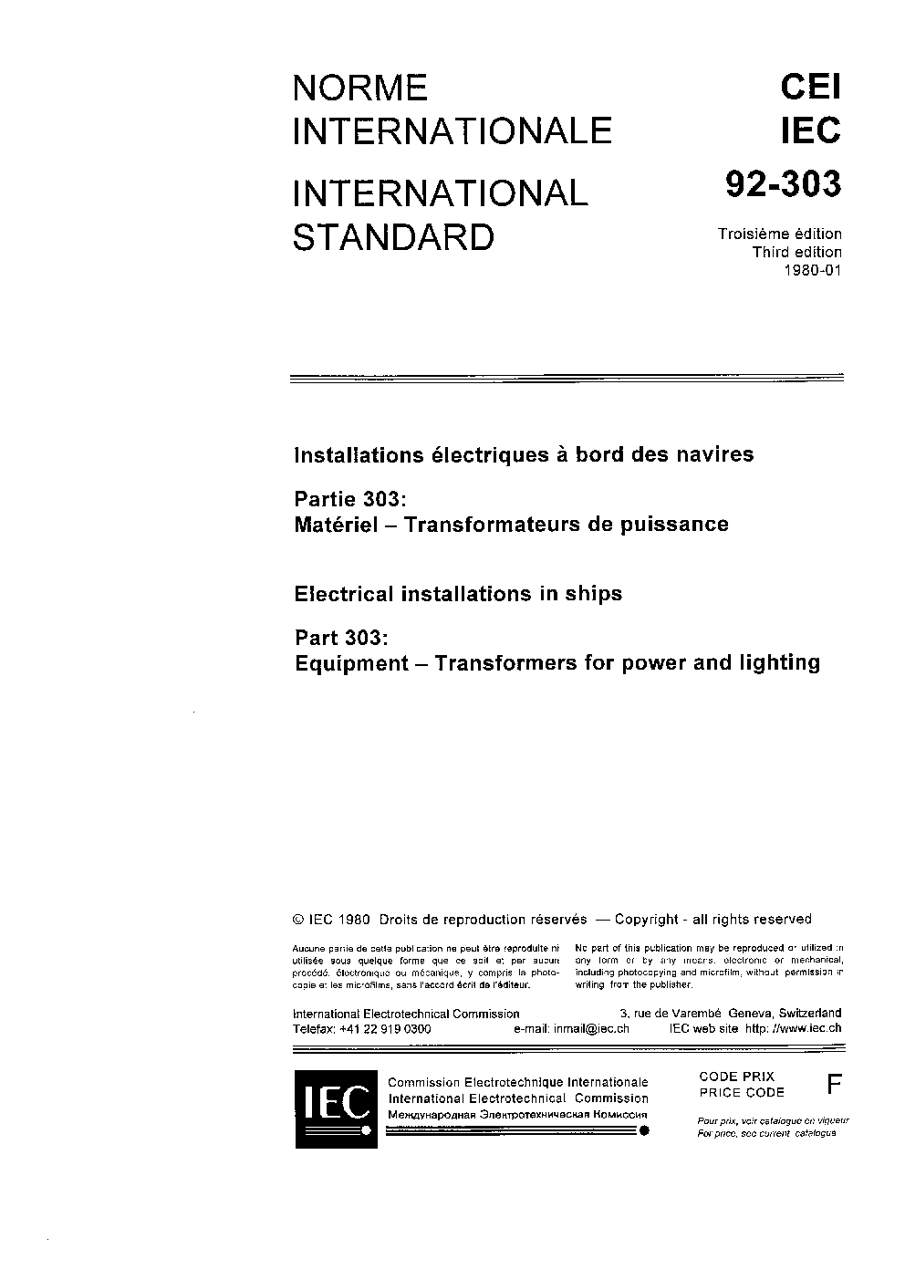 IEC 60092-303:1980 Electrical installations in ships - Part 303: Equipment - Transformers for power and lighting