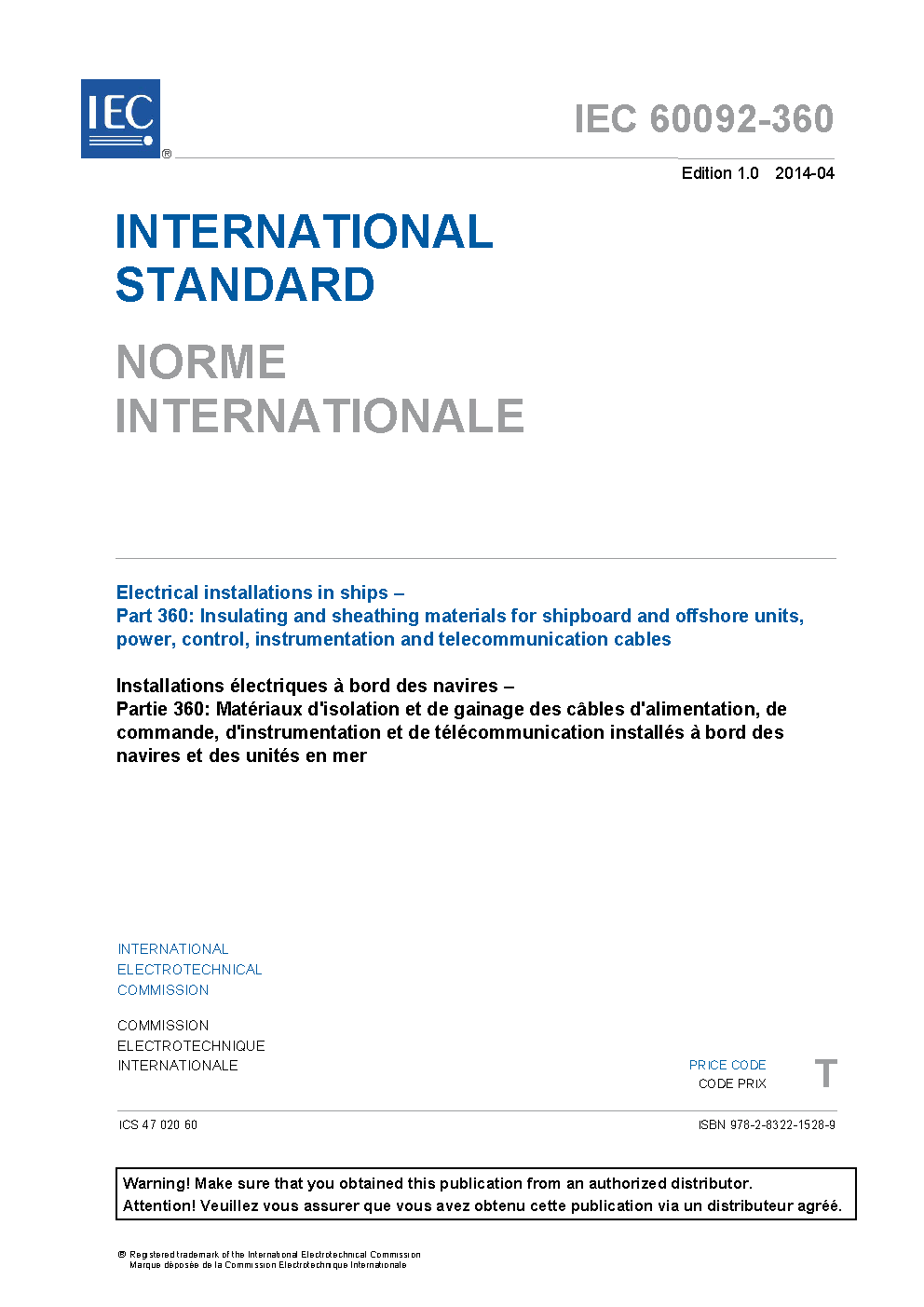 IEC 60092:2021 specifies the requirements for electrical, mechanical and particular characteristics of insulating and sheathing materials intended for use in shipboard and fixed and mobile offshore unit power, control, instrumentation and telecommunication cables.