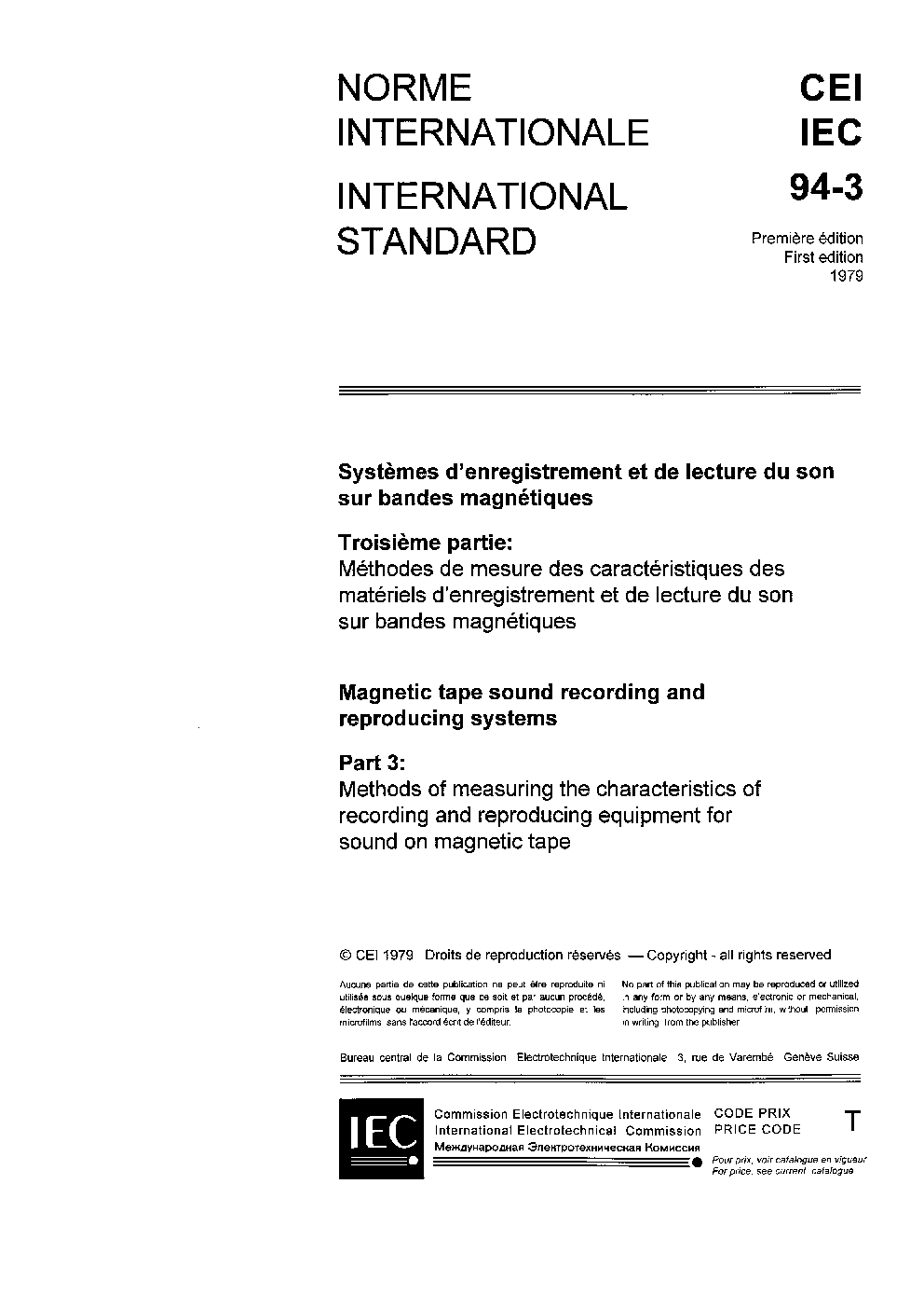IEC 60094-3:1979/AMD3:1996 Amendment 3 - Magnetic tape sound recording and reproducing systems. Part 3: Methods of measuring the characteristics of recording and reproducing equipment for sound on magnetic tape