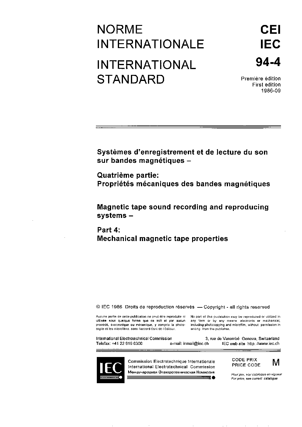 IEC 60094-4:1986 Magnetic tape sound recording and reproducing systems. Part 4: Mechanical magnetic tape properties