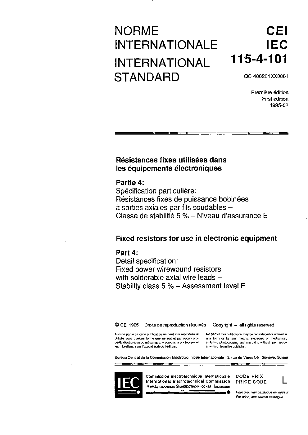 IEC 60115-4-101:1995 Fixed resistors for use in electronic equipment - Part 4: Detail specification: Fixed power wirewound resistors with solderable axial wire leads - Stability class 5%. Assessment level E