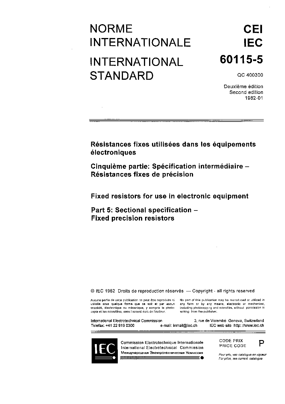 IEC 60115-5:1982 Fixed resistors for use in electronic equipment - Part 5: Sectional specification: Fixed precision resistors