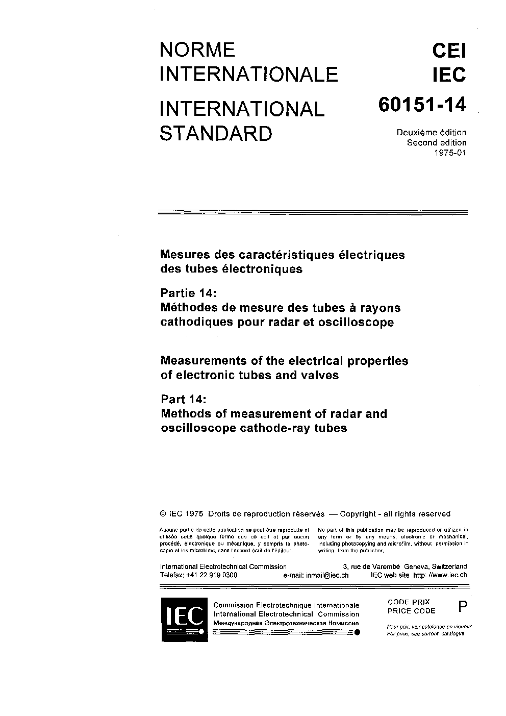 IEC 60151-14:1975 Measurements of the electrical properties of electronic tubes and valves. Part 14: Methods of measurement of radar and oscilloscope cathode-ray tubes