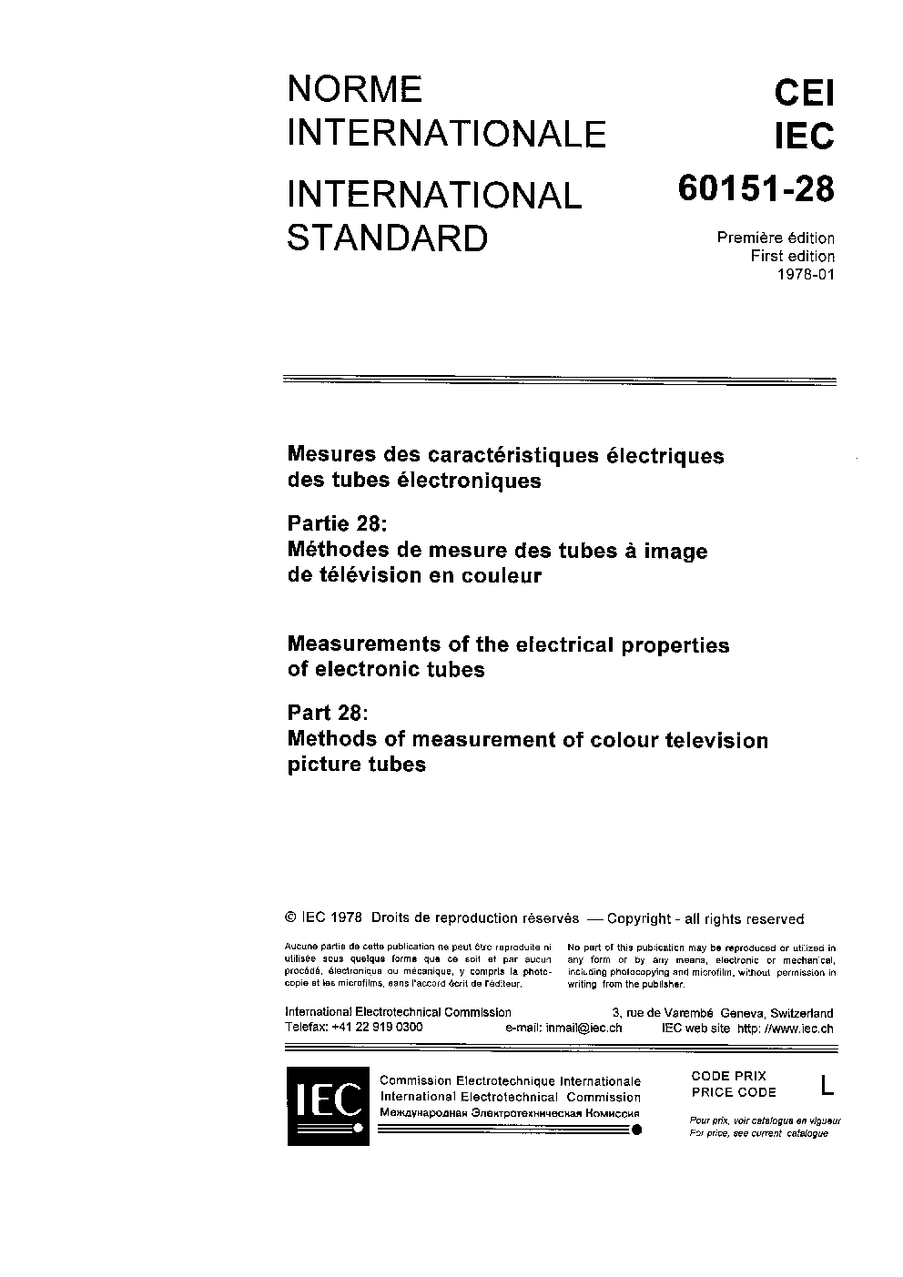 IEC 60151-28:1978 Measurements of the electrical properties of electronic tubes - Part 28: Methods of measurement of colour television picture tubes