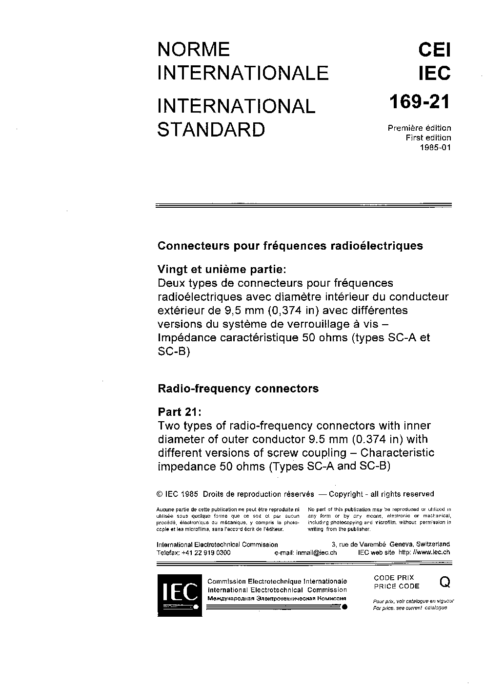 IEC 60169-21:1985/AMD1:1996 Amendment 1 - Radio-frequency connectors. Part 21: Two types of radio-frequency connectors with inner diameter of outer conductor 9.5 mm (0.374 in) with different versions of screw coupling - Characteristic impedance 50 ohms (Types SC-A and SC-B)