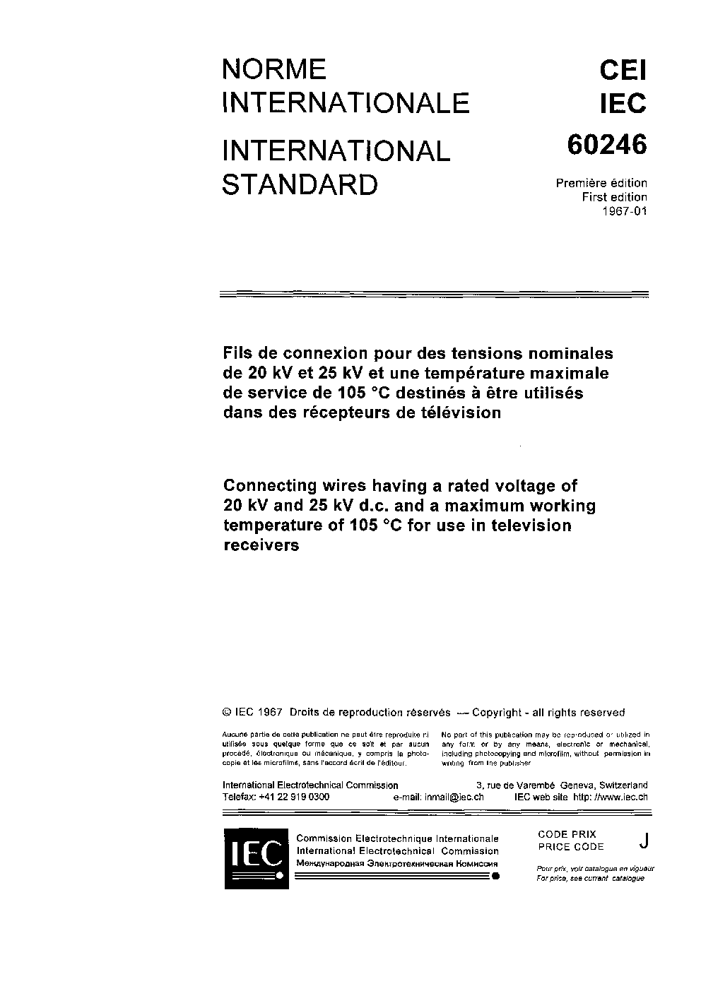 IEC 60246:1967 Connecting wires having a rated voltage of 20 kV and 25 kV d.c. anda maximum working temperature of 105 °C for use in televisionreceivers