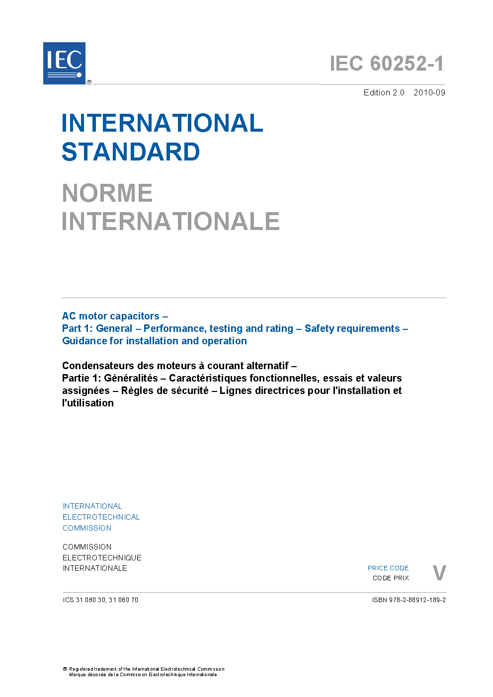 IEC 60252-1:2010 AC motor capacitors - Part 1: General - Performance, testing and rating - Safety requirements - Guidance for installation and operation