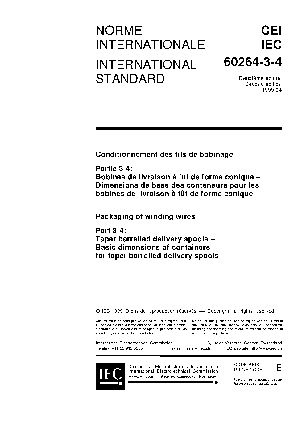 IEC 60264-3-4:1999 Packaging of winding wires - Part 3-4: Taper barrelled delivery spools - Basic dimensions of containers for taper barrelled delivery spools
