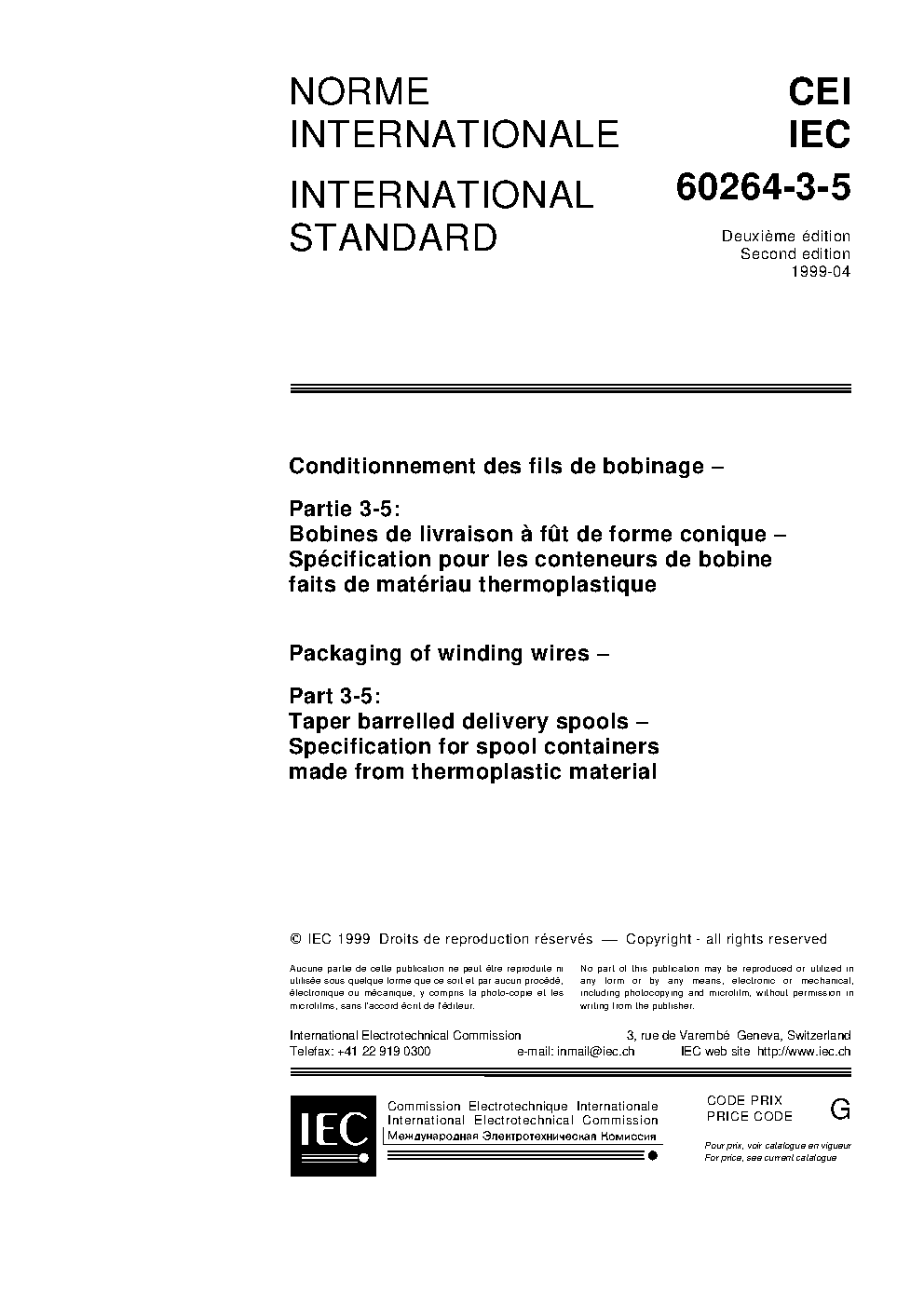 IEC 60264-3-5:1999 Packaging of winding wires - Part 3-5: Taper barrelled delivery spools - Specification for spool containers made from thermoplastic material
