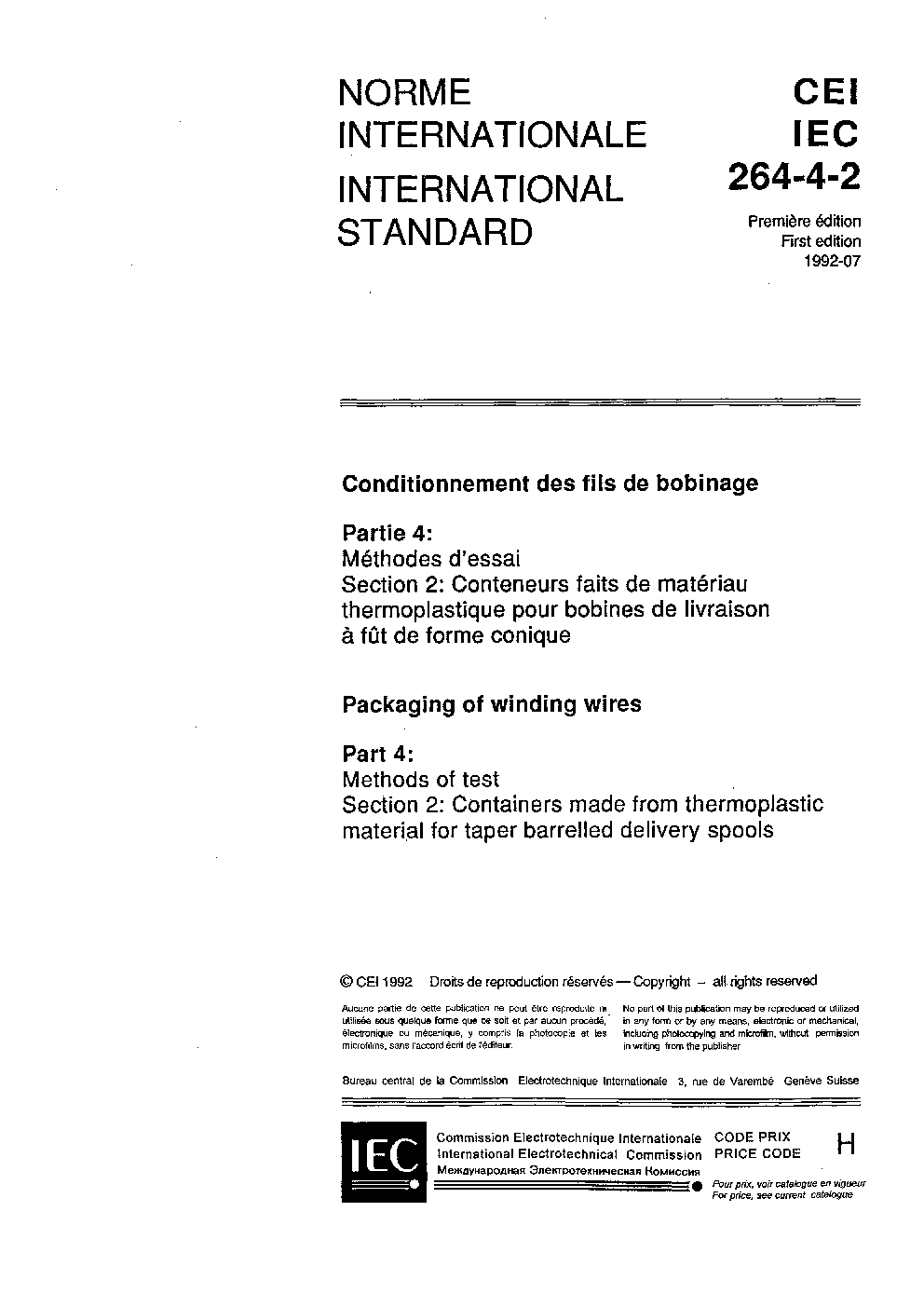 IEC 60264-4-2:1992 Packaging of winding wires - Part 4: Methods of test - Section 2: Containers made from thermoplastic material for taper barrelled delivery spools