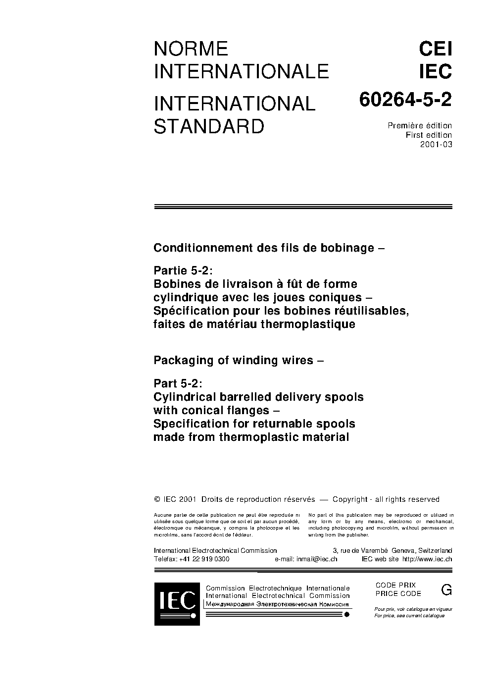 IEC 60264-5-2:2001 Packaging of winding wires - Part 5-2: Cylindrical barrelled delivery spools with conical flanges - Specification for returnable spools made from thermoplastic material