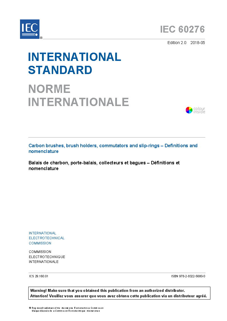 IEC 60276:2018 applies to carbon brushes for electrical machinery. This edition applies only to carbon brushes for commutators and slip-rings in rotating machines. Terms and definitions are relative to the brush construction (references 100’s to 500’s and parts of 900’s) and to the markings when operating on a rotating machine (references 600’s to 800’s).