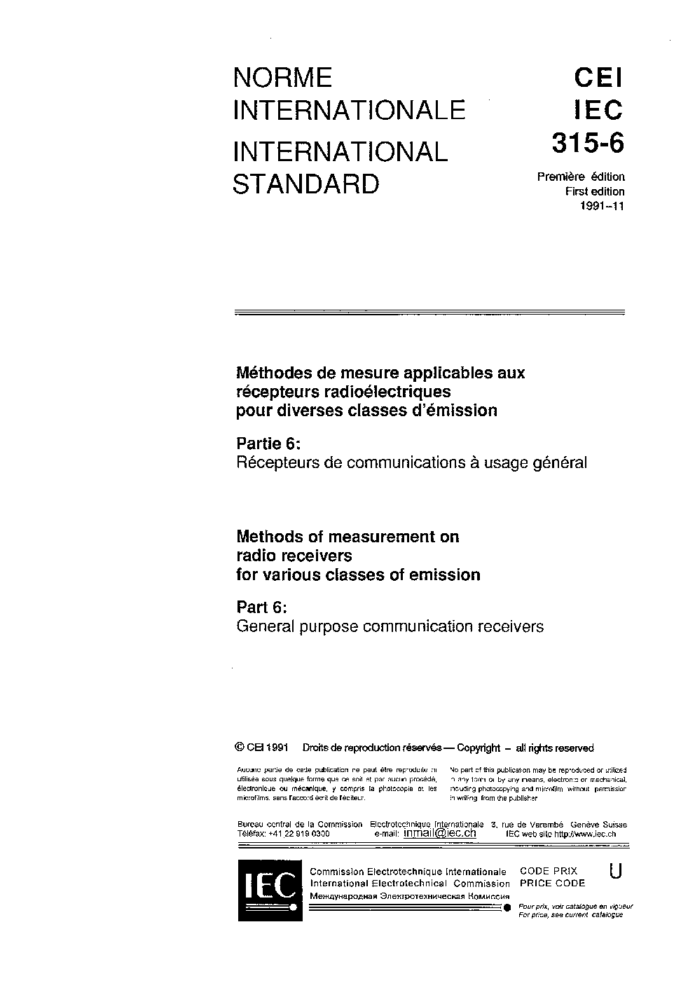 IEC 60315-6:1991/COR1:1997 Corrigendum 1 - Methods of measurement on radio receivers for various classes of emission - Part 6: General purpose communication receivers
