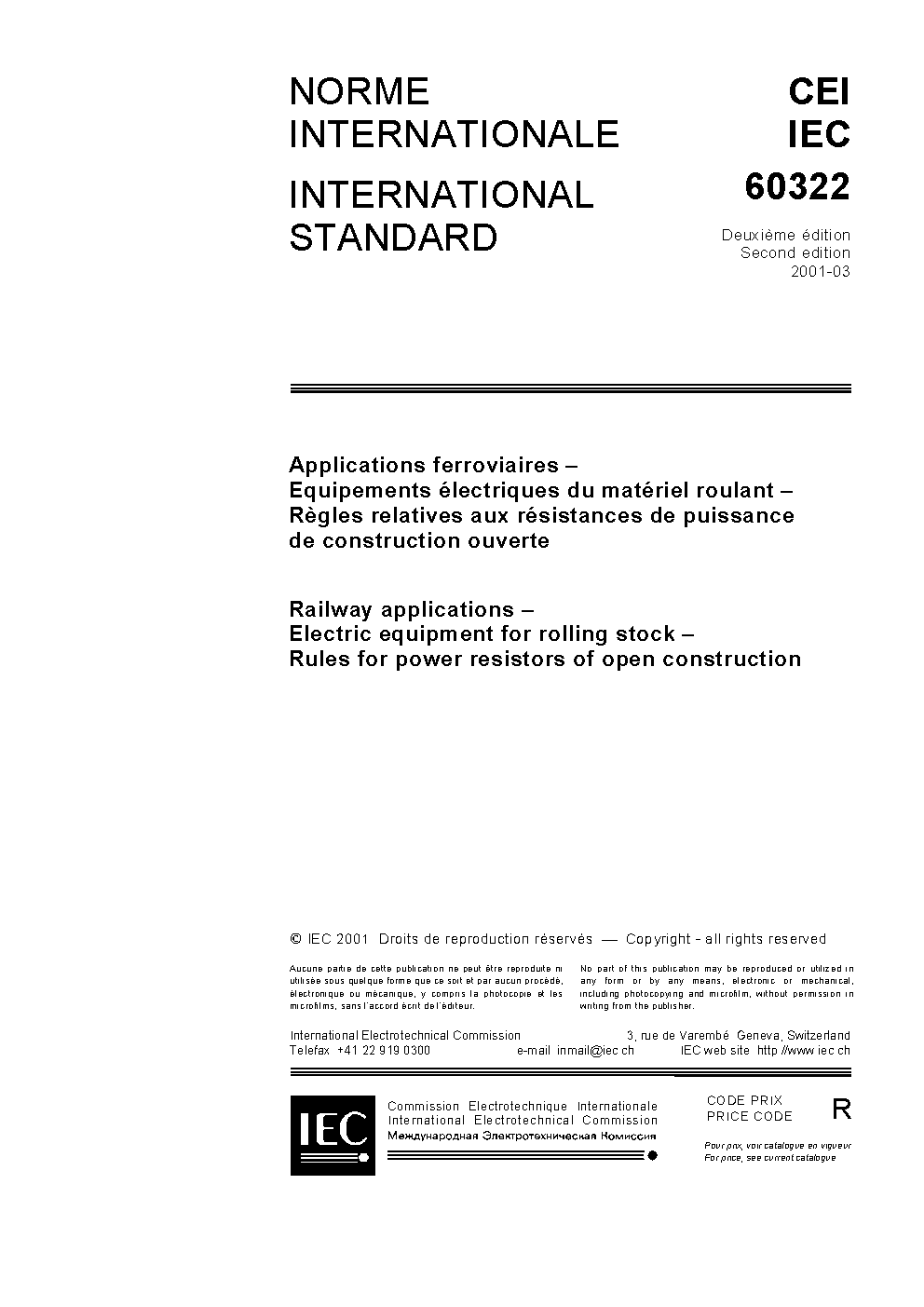 IEC 60322:2001 Railway applications - Electric equipment for rolling stock - Rules for power resistors of open construction