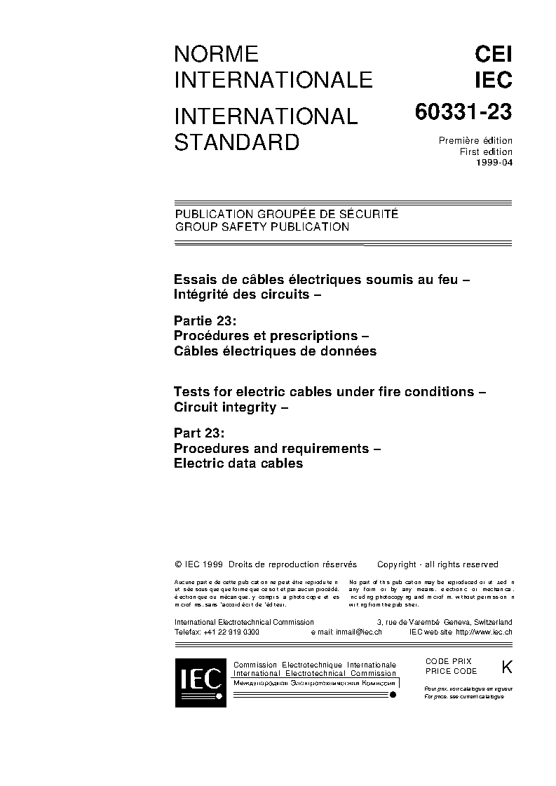 IEC 60331-23:1999 Specifies the test procedure and gives the performance requirement, including a recommended flame application time, for electric data cables required to maintain circuit integrity when subjected to fire under specified conditions. Describes the means of sample preparation, continuity checking arrangements, electrical testing procedure, method of burning the cables and gives requirements for evaluating test results. Covers electric data cables which have no rated voltage and are used for extra low voltage circuits.