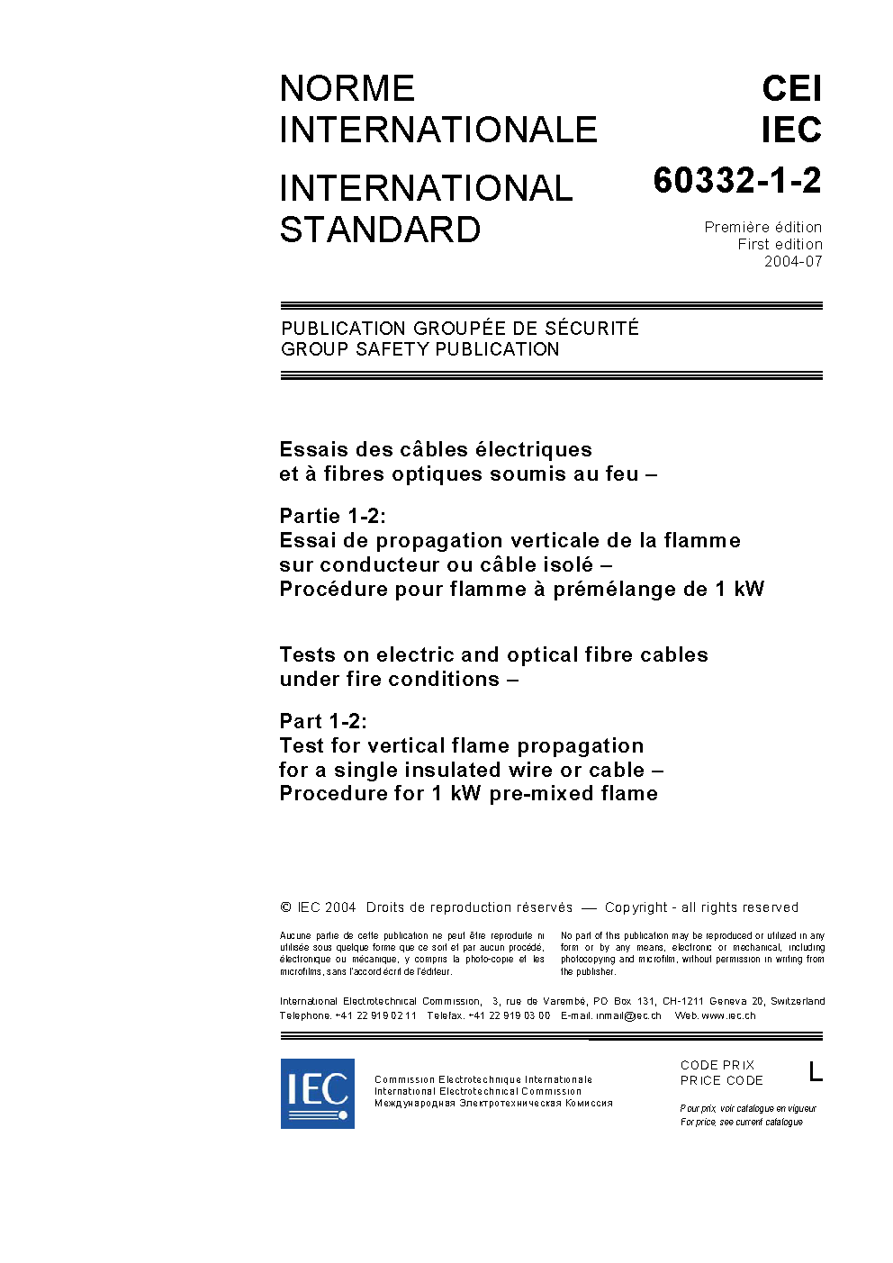 IEC 60332-1-2:2025 specifies the procedure for testing the resistance to vertical flame propagation for a single vertical electrical insulated conductor or cable, or optical fibre cable, under fire conditions using a 1 kW pre-mixed flame. The apparatus is described in IEC 60332-1-1.