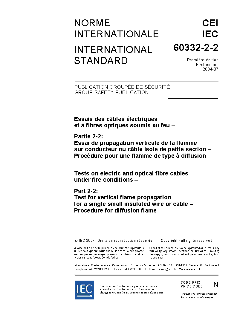 IEC 60332-2-2:2004 Specifies the procedure for testing the resistance to vertical flame propagation for a single small vertical electrical insulated conductor or cable, or optical cable, under fire conditions. The apparatus is given in IEC 60332-2-1. This standard gives the procedure for testing small optical fibre cables or a small insulated conductor or cable when the method specified in IEC 60332-1-2 is not suitable because some small optical fibre cables may break or small conductors may melt during the application of the flame. The recommended range of application is for the testing of small single insulated conductors or cables of less than 0,5 mm² cross-section. NOTE Since the use of insulated conductor or cable which retards flame propagation and complies with the recommended requirements of this standard is not sufficient by itself to prevent propagation of fire under all conditions of installation, it is recommended that wherever the risk of propagation is high, for example, in long vertical runs of bunches of cables, special installation precautions should also be taken. It cannot be assumed that because the sample of cable complies with the performance requirements recommended in this standard, that a bunch of cables will behave in a similar manner. (See IEC 60332-3 series.) Recommended requirements for performance are given in Annex A.
