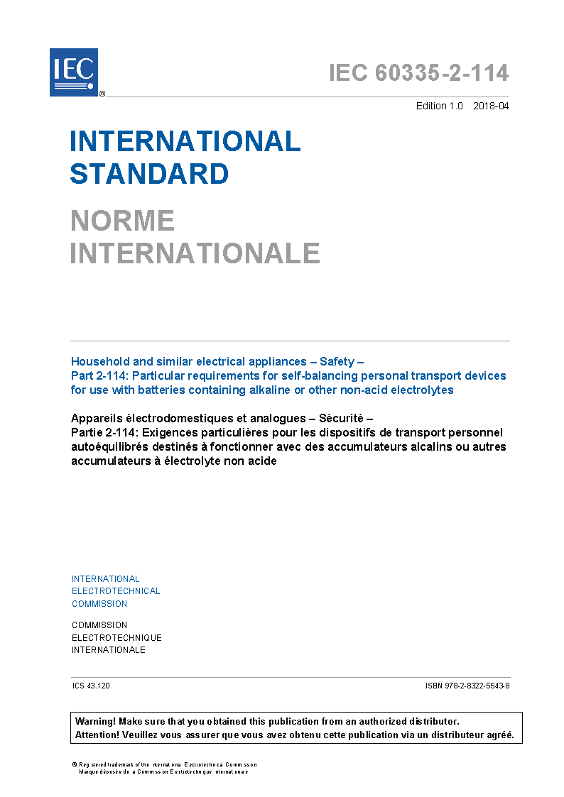 IEC 60335-2-114 Ed.1.0 Household and similar electrical appliances - Safety - Part 2-114: Particular requirements for self-balancing personal transport devices for use with batteries containing alkaline or other non-acid electrolytes